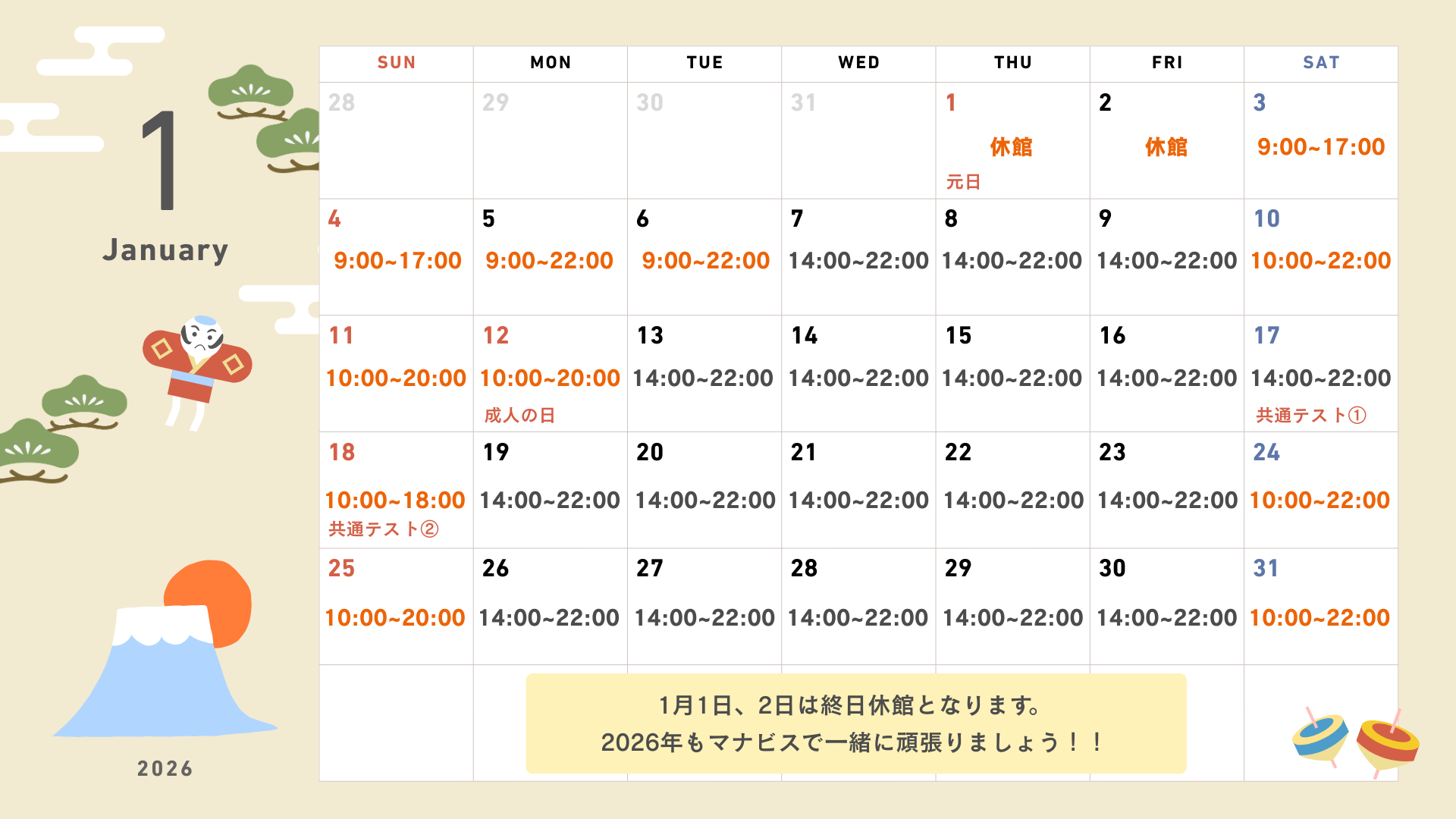 平日・土曜 14:00~22:00 日曜・祝日 10:00~18:00※年間では休館日があります。※時期によって開館時間が異なることがあります。詳細は校舎にお問い合わせください。