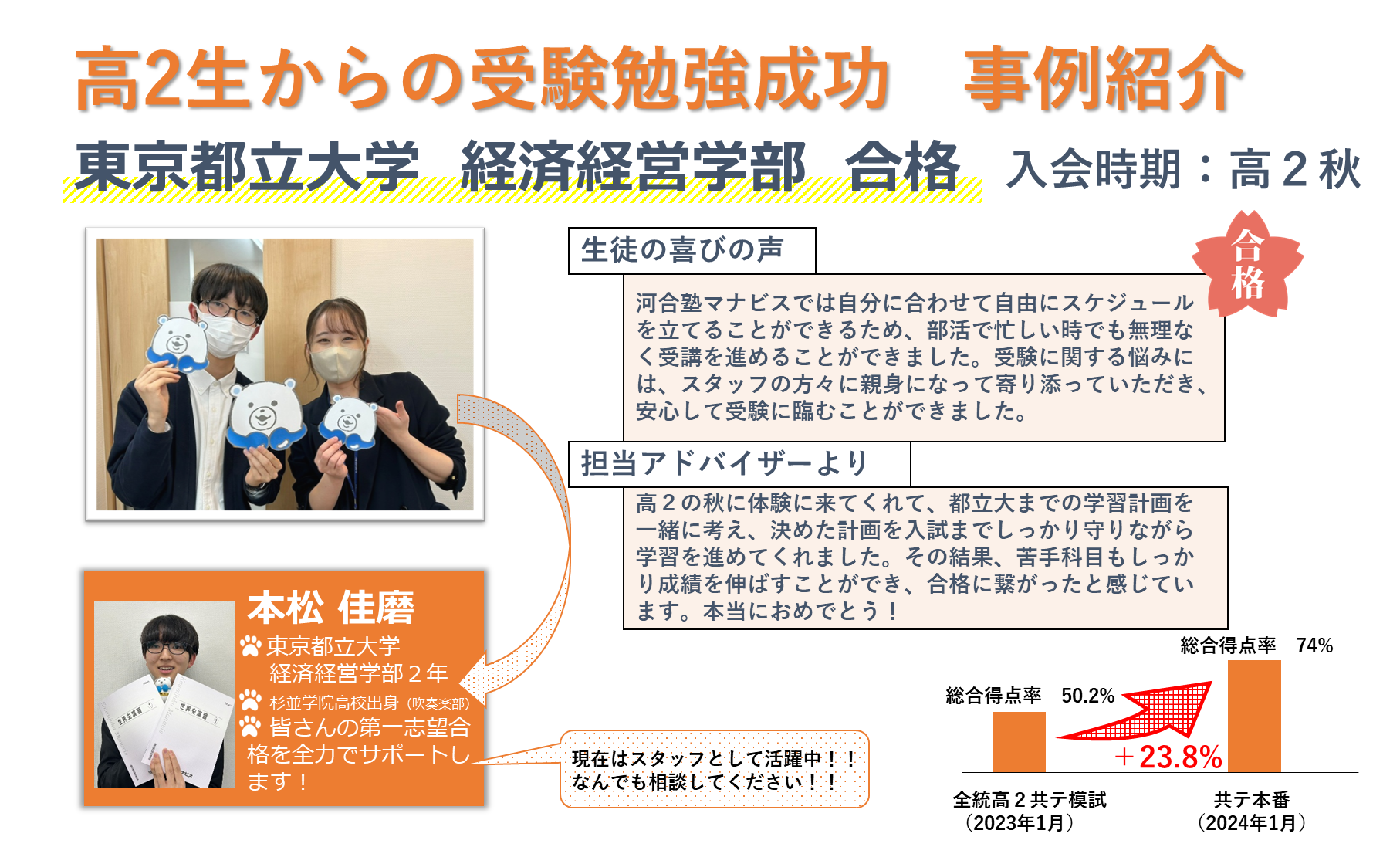 部活が忙しいながらも、両立しながらほぼ毎日マナビスに来校してくれていました!校舎の環境を活用し勉強時間を着実に作り、その積み重ねでものすごく成績が伸びた生徒さんだったと思います!その努力の結果で志望していた大学に合格できたと感じています!本当におめでとう! |