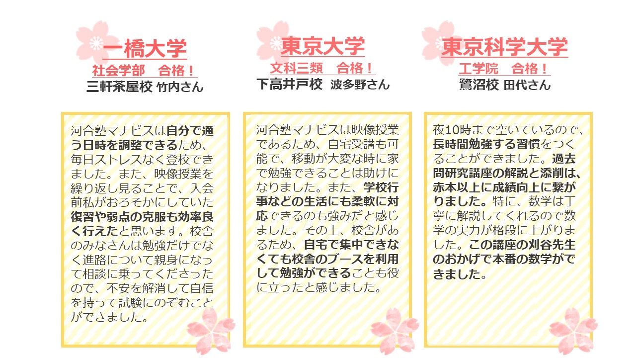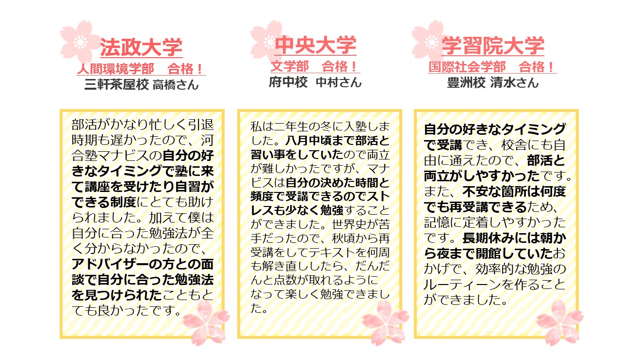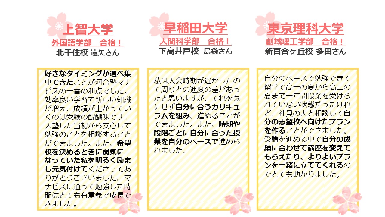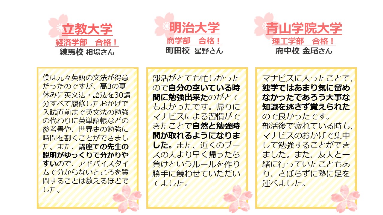 上記の合格実績は一部となります。他にもたくさんの方が合格を勝ち取ってくれました。