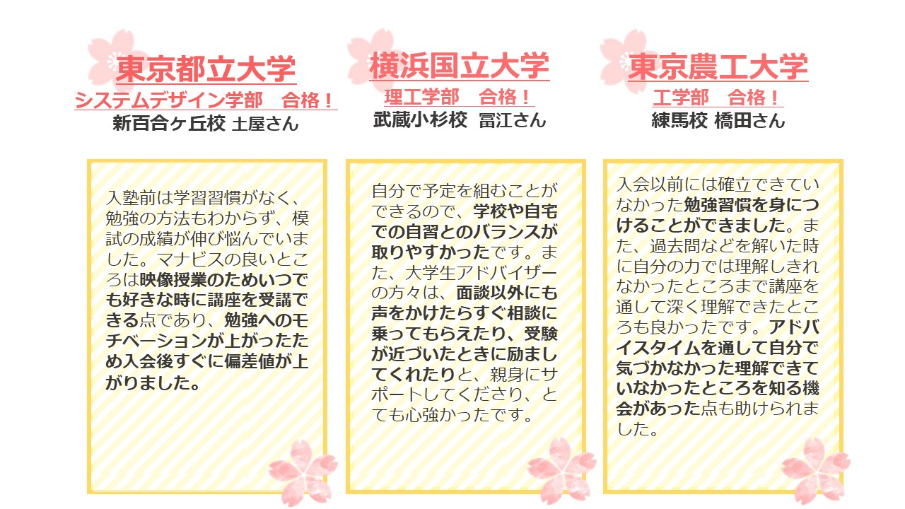 現役合格を勝ち取るには、最新の情報をキャッチして、学習計画や受験戦略に反映させることも大切です。マナビスには、全国の豊富な受験情報や過去の受験戦略のノウハウが蓄積されています。その中から、生徒様一人ひとりに合った入試情報をピックアップしてご提供いたします。
