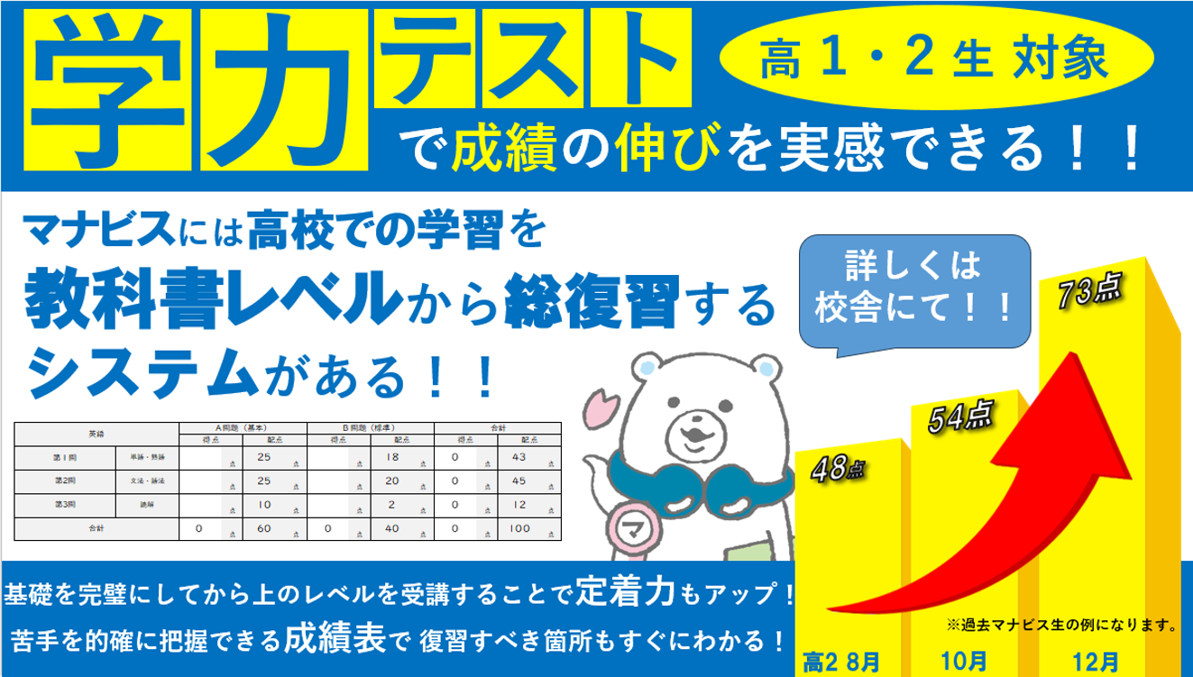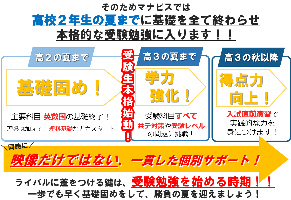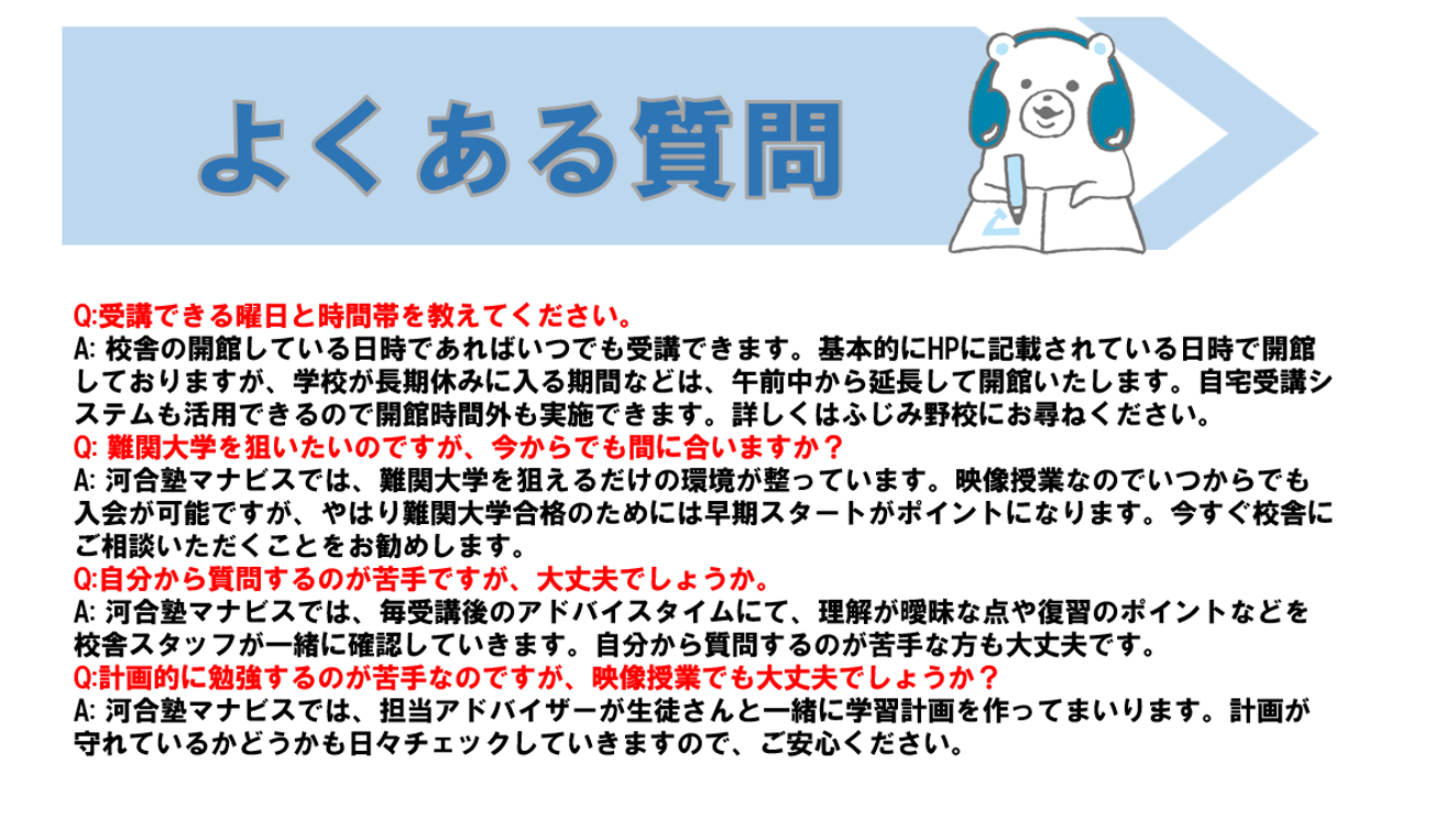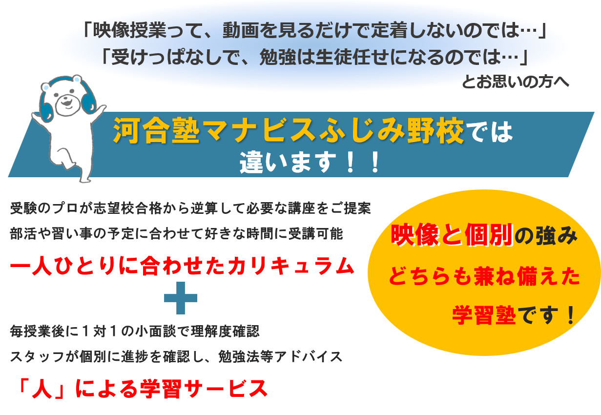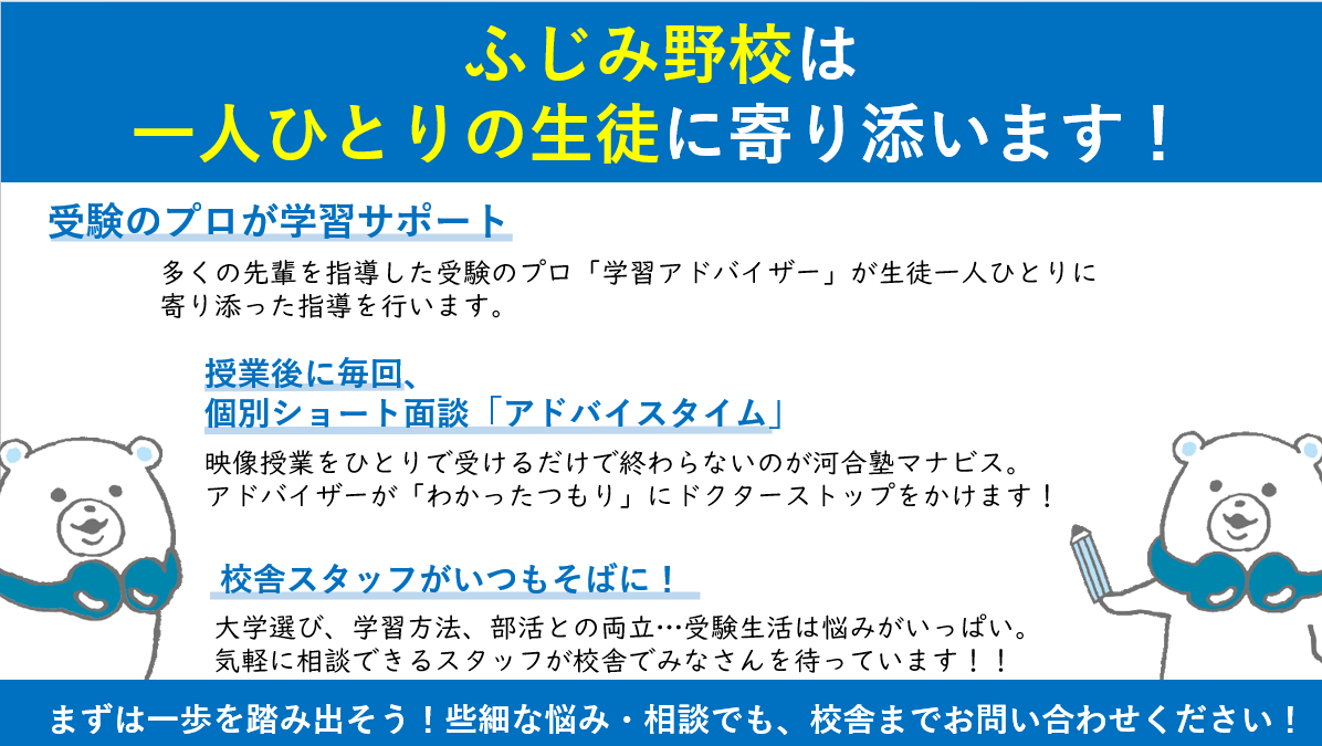 河合塾マナビスふじみ野校は、一人ひとりが持つ力を引き出し、一人ひとりに合わせた学習計画と受験戦略で、ひとつ上の現役合格へ導くことを心がけております。