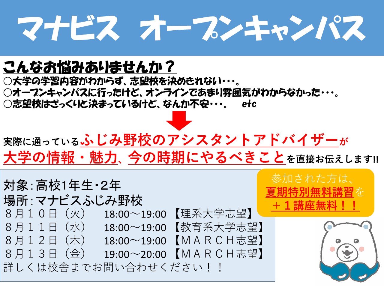 平日 14:00~22:00土曜 14:00~22:00日祝 10:00~18:00※年間では休館日があります。※時期によって開館時間が異なることがあります。詳細は校舎にお問い合わせください。