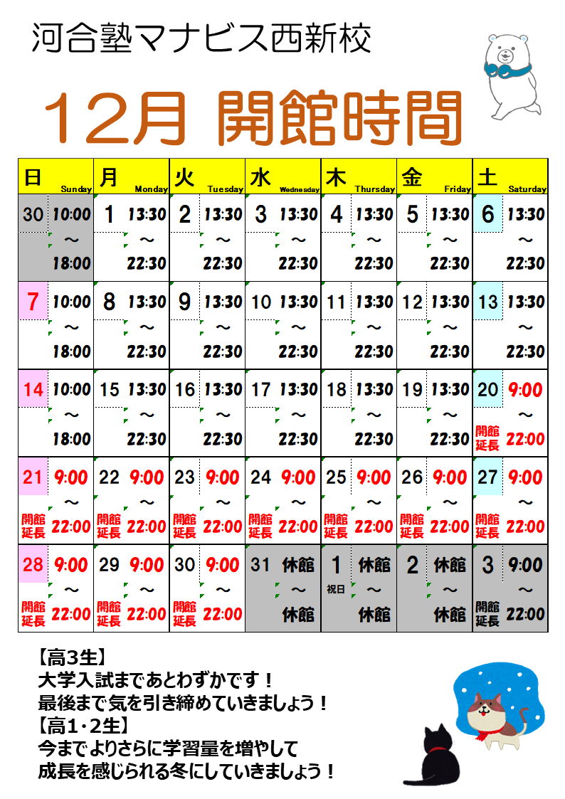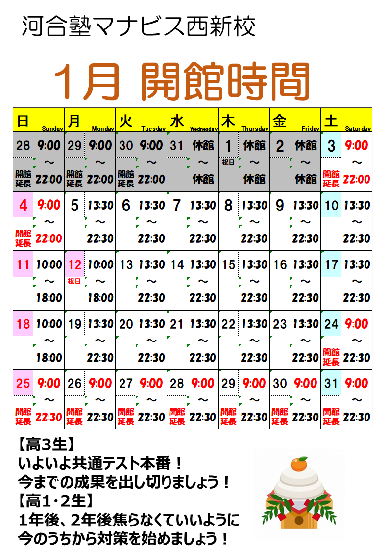 河合塾マナビス西新校 開館カレンダー