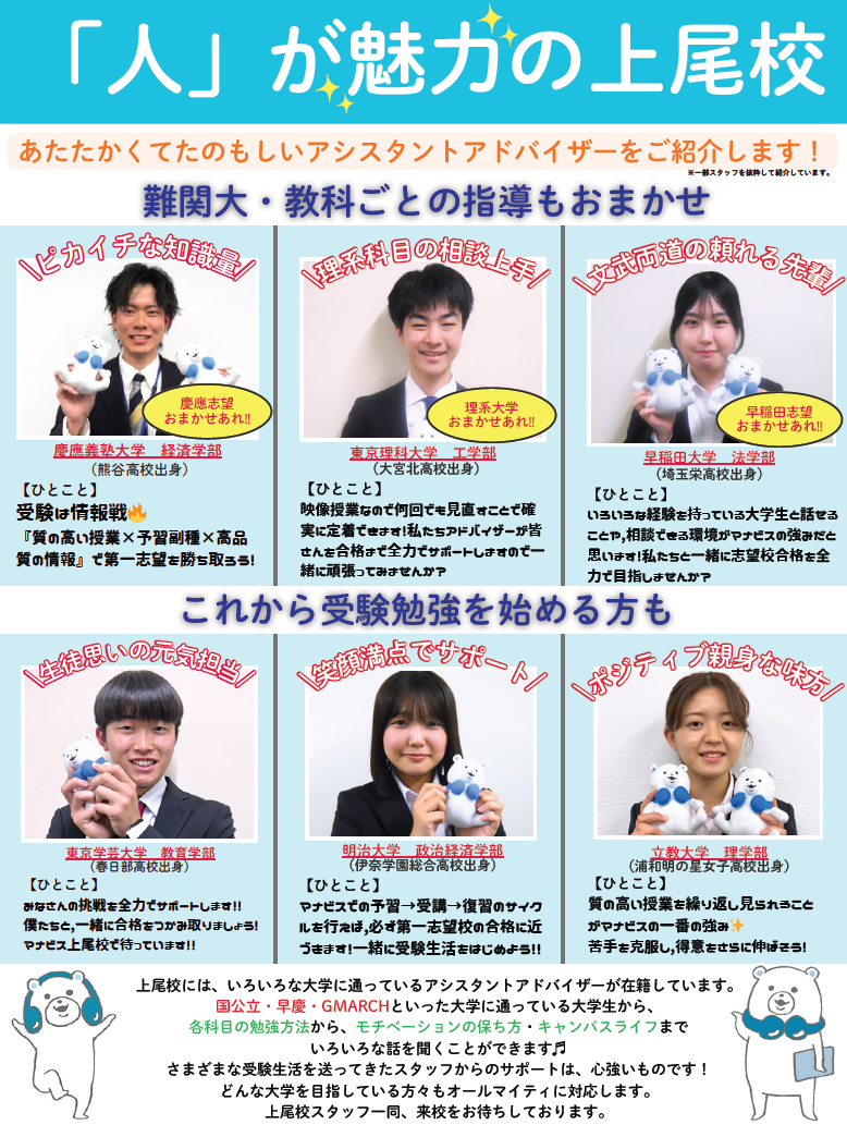 受験生のときに生徒様と同じようにマナビスに通っていたアシスタントアドバイザーが皆さんを日々手助けします!上尾校のスタッフ達は、さいたま市北区・上尾市・桶川市居住がほとんどなので、皆さんからも身近な存在としてサポートできます。学習方法のアドバイスだけでなく、部活動との両立や大学選びなどの勉強以外のこともお気軽にご相談ください。
