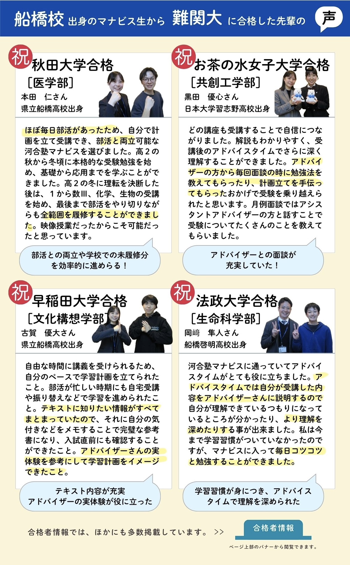 予備校探しでお困りのことがございましたら是非河合塾マナビス船橋校へご相談ください。