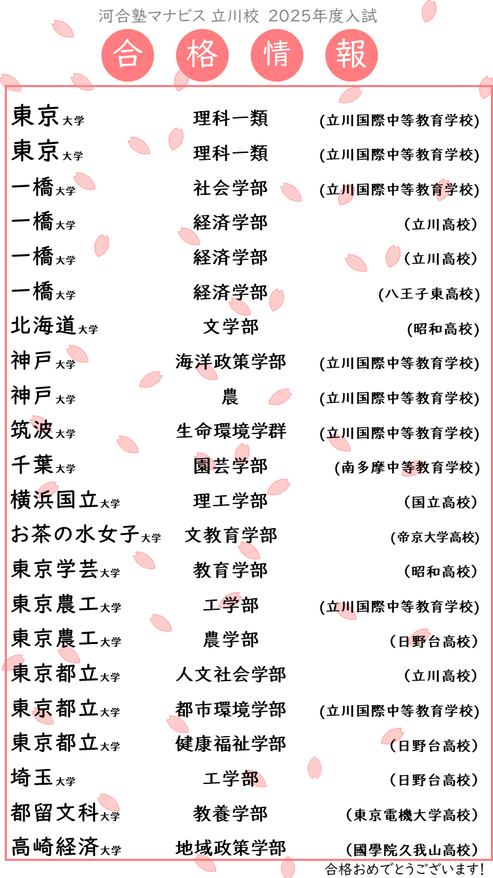 ペースが異なりますので、マナビス立川校では専用のカリキュラムで