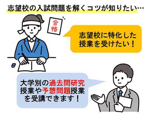 河合塾マナビスの「大学別対策講座」では、入試問題に精通したトップ講師が、「特徴的な問題」「差がつく問題」「合否を分けるポイントと攻略法」を的確に指導します。