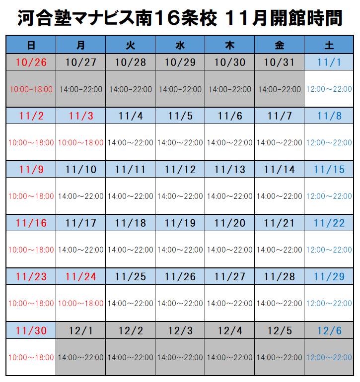 平日 14:00~22:00土曜 12:00~22:00日曜・祝日 10:00~18:00※年間では休館日があります。※時期によって開館時間が異なることがあります。詳細は校舎にお問い合わせください。
