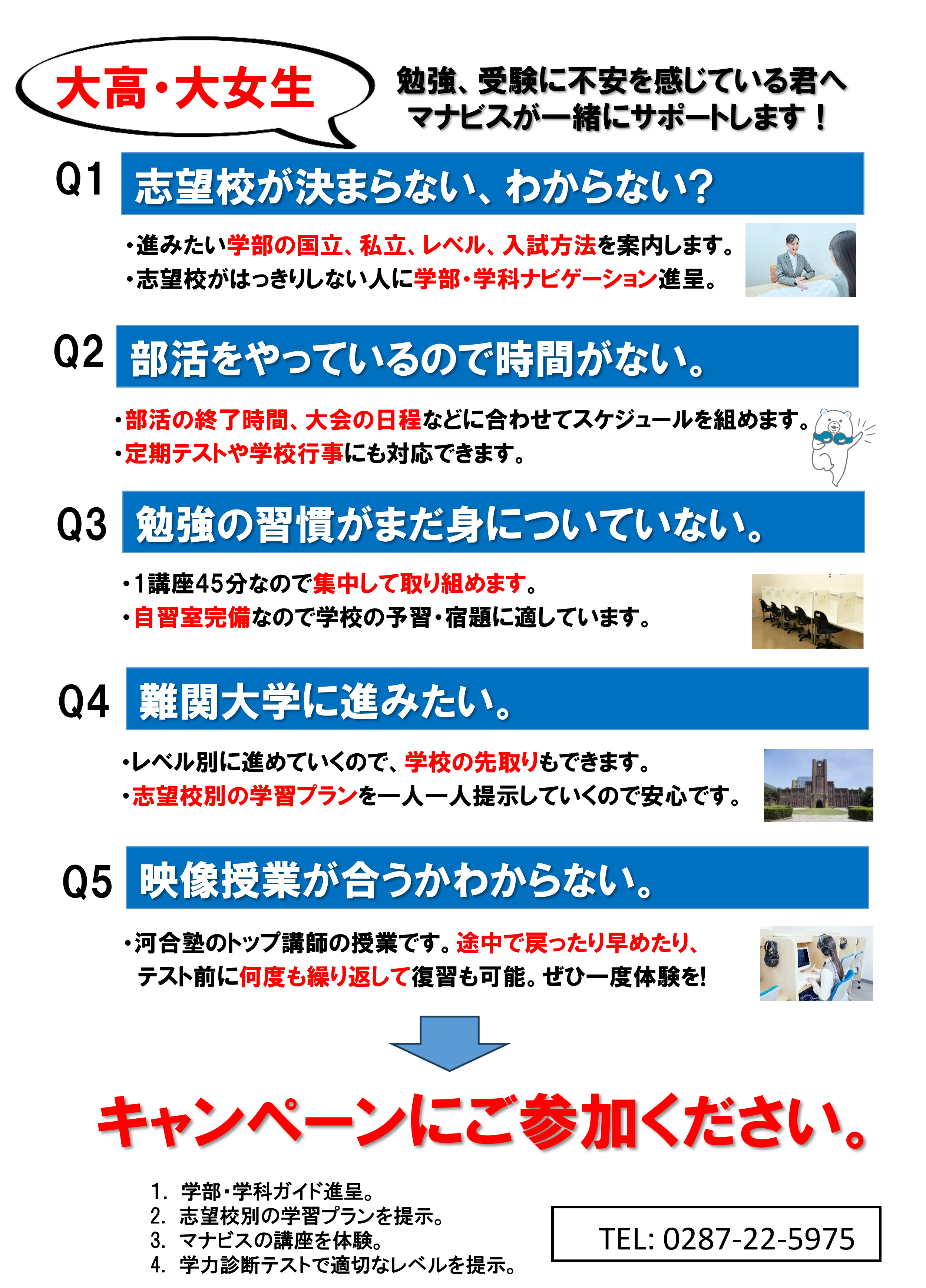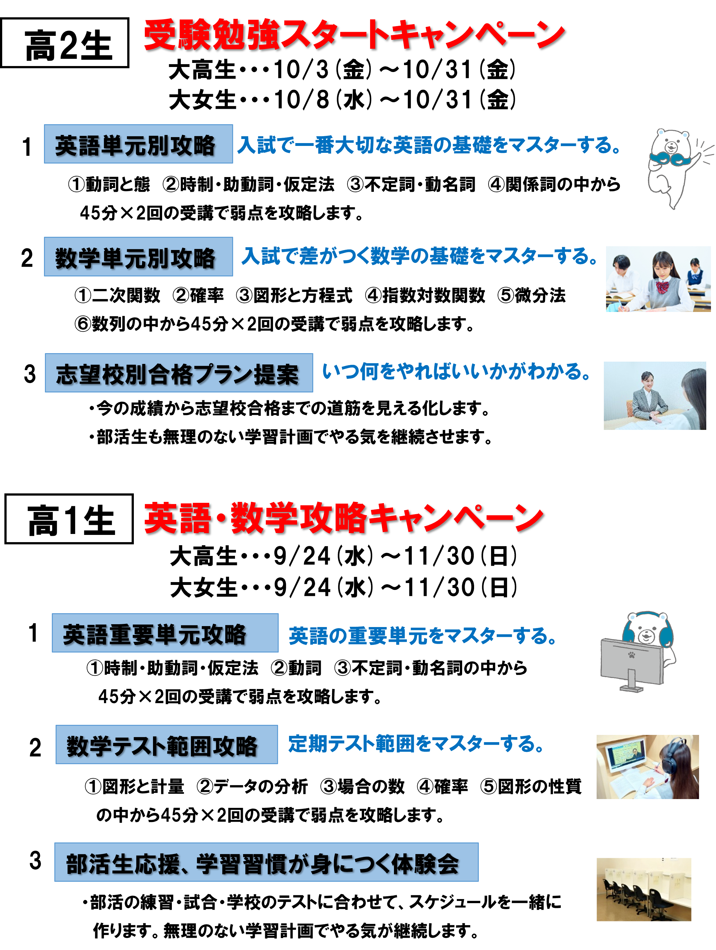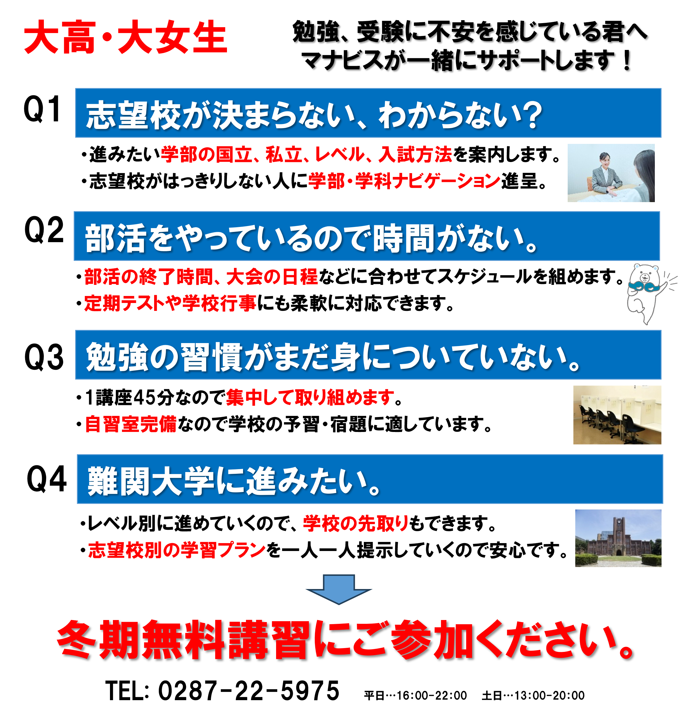 平日 16:00~22:30土曜 12:30~22:30日曜・祝日 12:30~20:30※年間では休館日があります。※時期によって開館時間が異なることがあります。詳細は校舎にお問い合わせください。