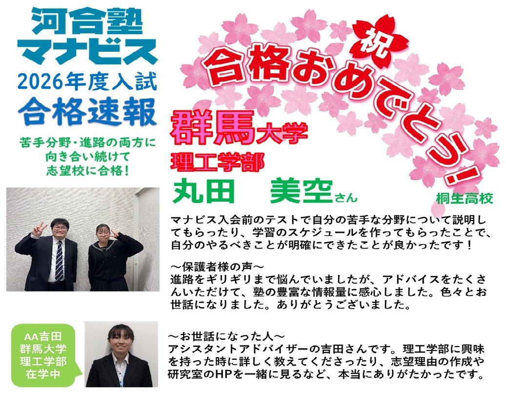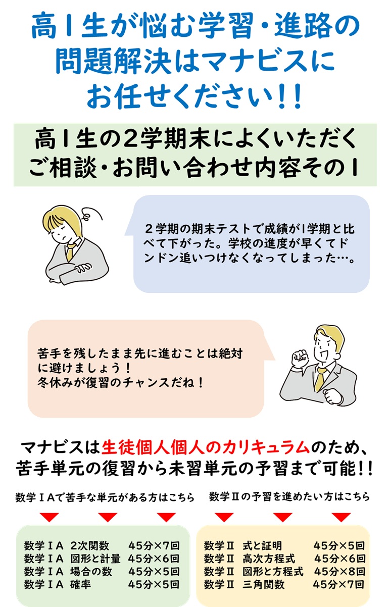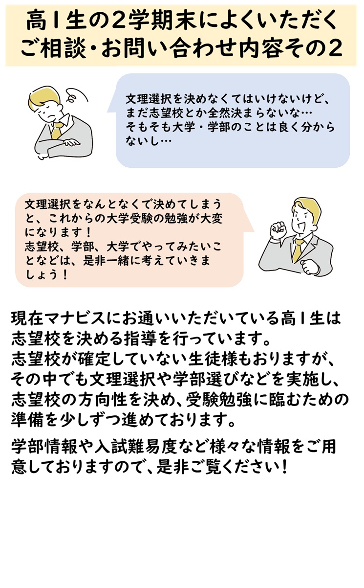 地方国公立型、私立文系型など生徒の志望校状況に合わせた学習プランニングをご提案させていただきます。 大学入試に強い河合塾マナビスにお任せください!