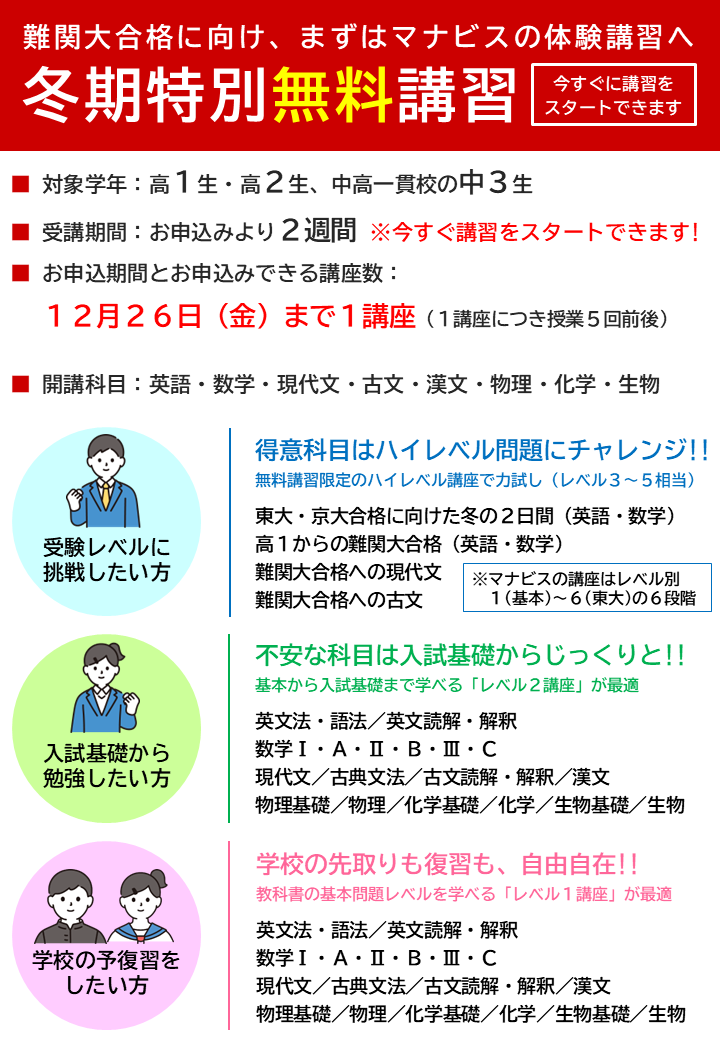 ◎河合塾マナビス川口校は大学現役合格を目指す映像授業の予備校です。 『河合塾の映像授業×スタッフのサポート』で「わかる⇒できる」を実現します。 ・志望校になんとしても合格したい方 ・まだ志望校がはっきりと決まっておらず相談したい方 ・家ではうまく勉強が進まないので、授業だけでなく自習室も使いたい方 ・1科目だけでの通塾をご検討の方 ・部活との両立をしたい方 ぜひ、河合塾マナビス川口校にお問合せください!!