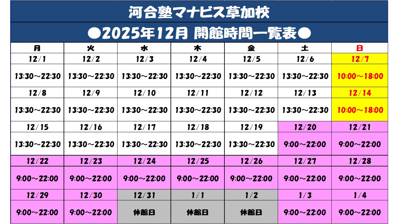平日・土曜 13:30~22:30日曜・祝日 10:00~18:00※年間では休館日があります。※時期によって開館時間が異なることがあります。詳細は校舎にお問い合わせください。