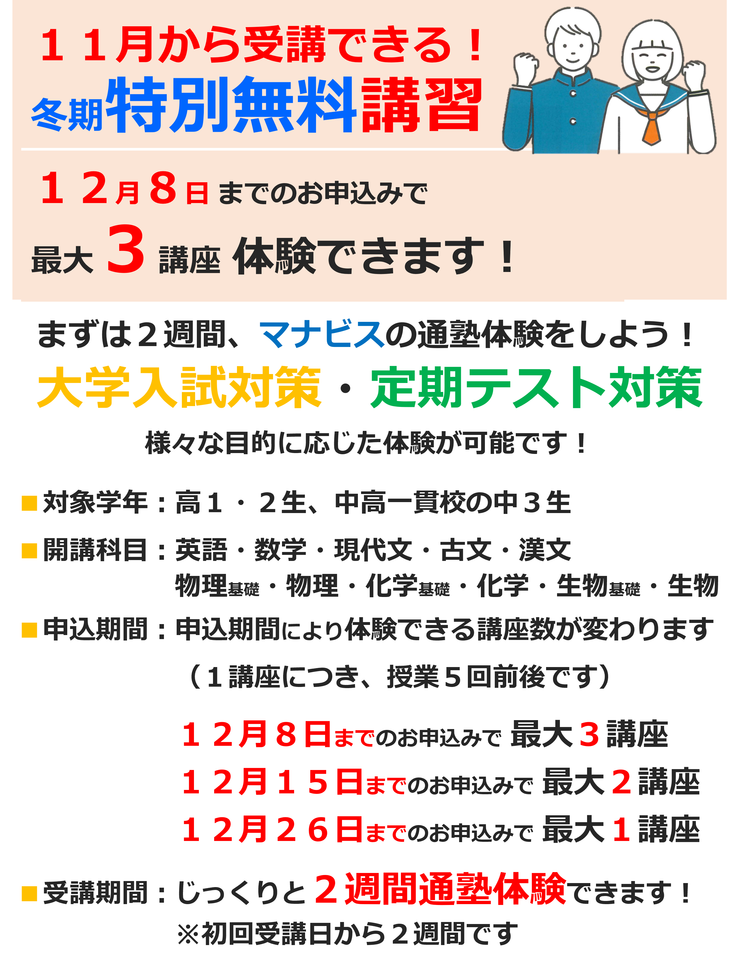 校舎HPをご覧になっていただき、ありがとうございます。河合塾マナビス木更津校は早期より多くの生徒様にお通い頂いております。既にお通い頂いている生徒様に適切な指導と学習環境を提供するために2025年度の高校3年生の生徒様の新規のお問い合わせと入会のご相談は、受付停止とさせていただいております。なお、短期間の有料季節講習や1・2年生のご入会希望は受け付けておりますので、校舎まで直接お電話でご相談ください。河合塾マナビス 木更津校電話番号:0438-20-0851