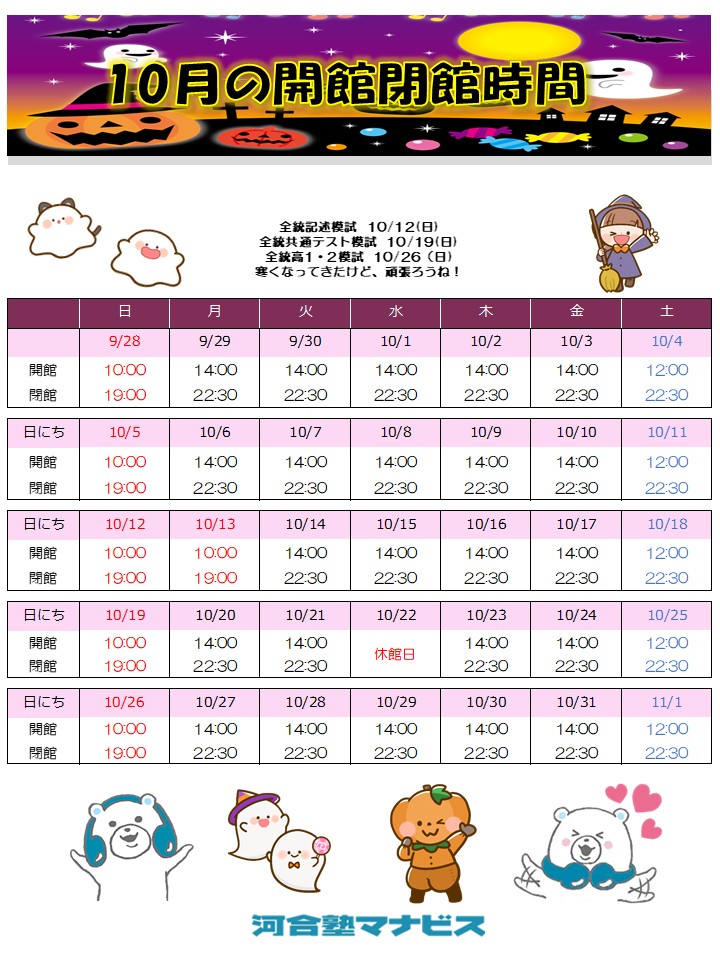平日 14:00~22:30土曜 12:00~22:30日曜・祝日 10:00~19:00※年間では休館日があります。※時期によって開館時間が異なることがあります。詳細は校舎にお問い合わせください。