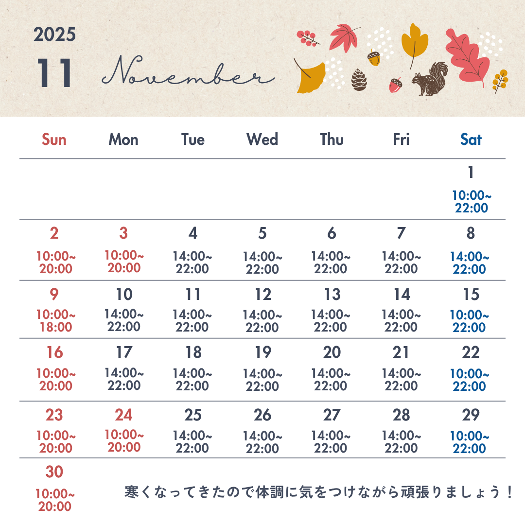 平日・土曜 14:00~22:00 日曜・祝日 10:00~18:00※年間では休館日があります。※時期によって開館時間が異なることがあります。詳細は校舎にお問い合わせください。