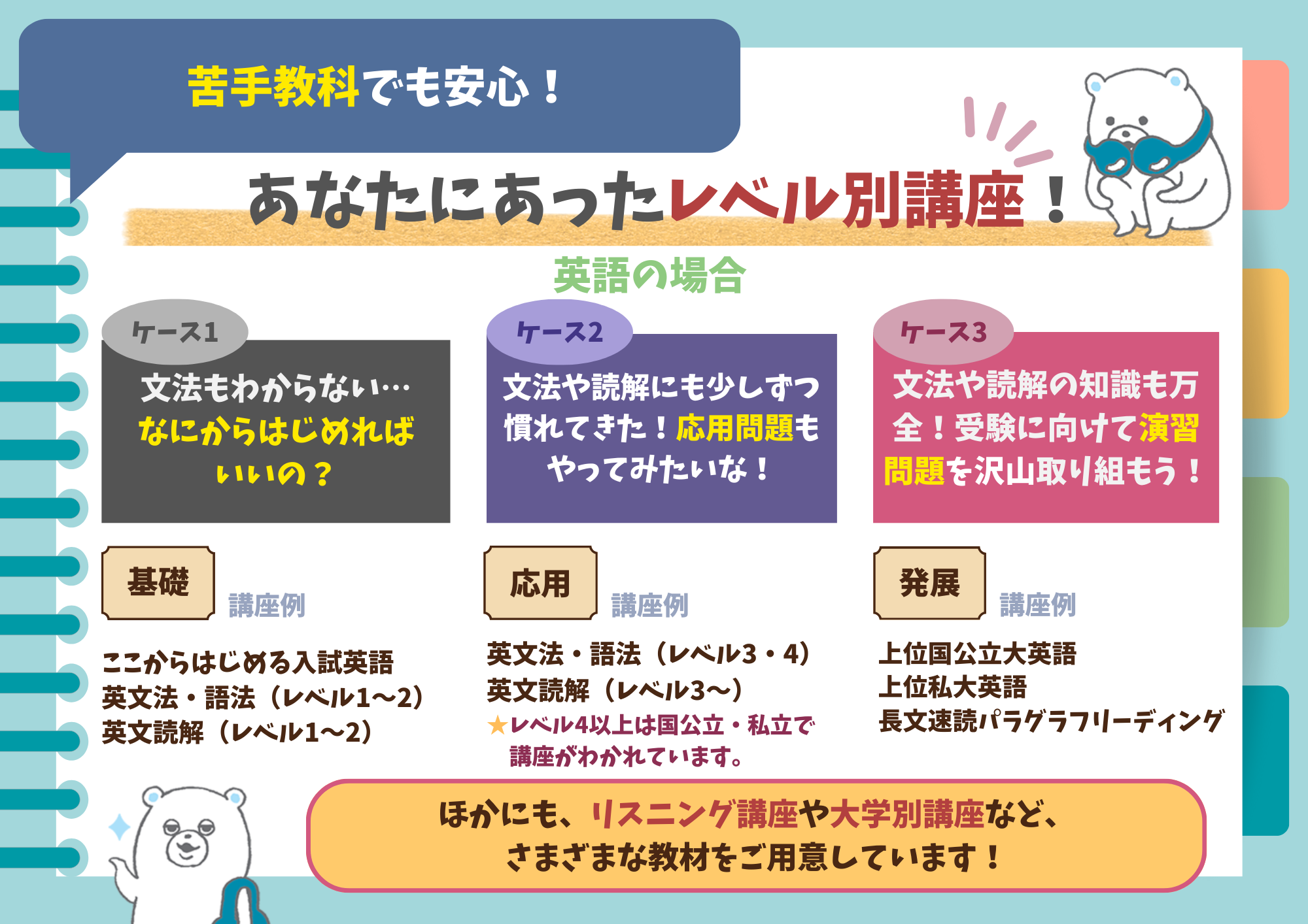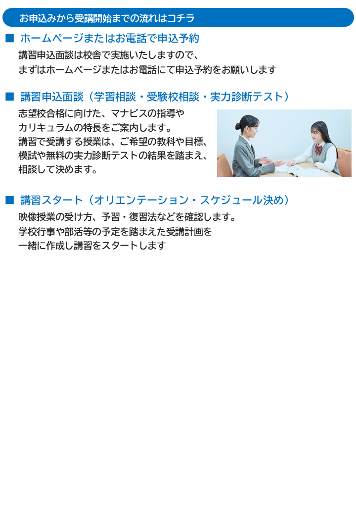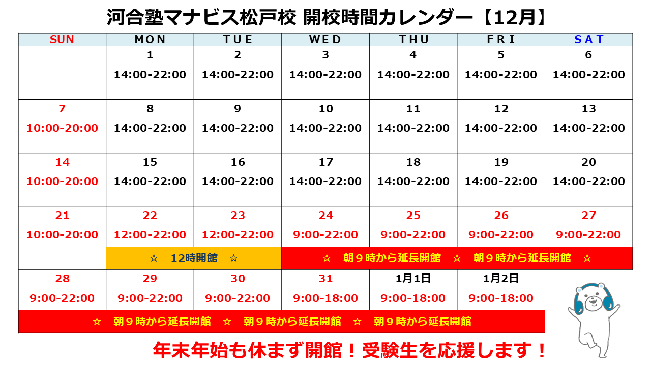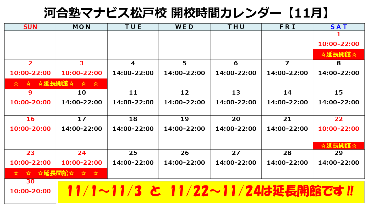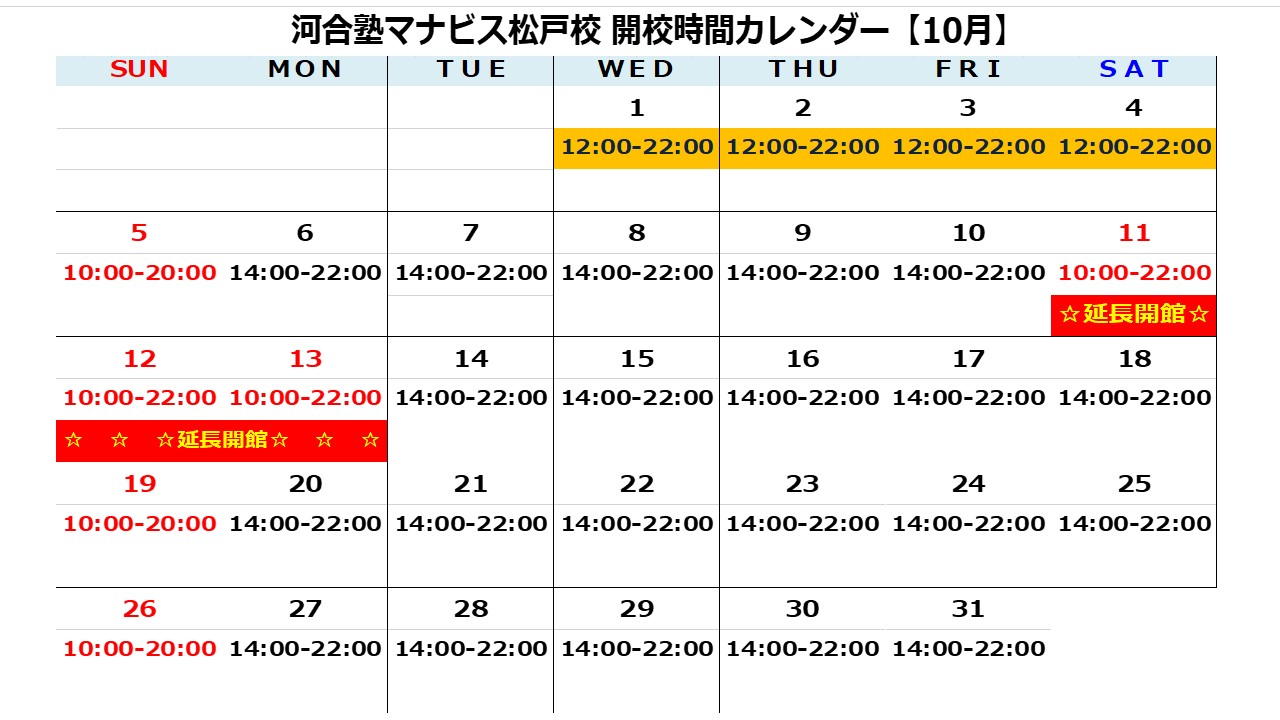 平日・土曜 14:00~22:00日曜・祝日 10:00~20:00※年間では休館日があります。※時期によって開館時間が異なることがあります。詳細は校舎にお問い合わせください。