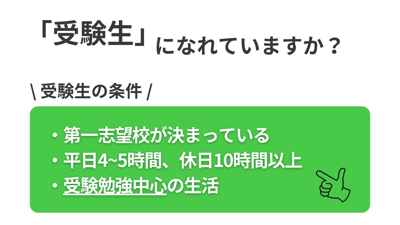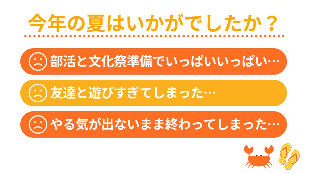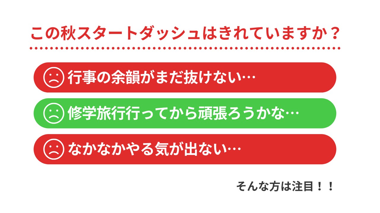 「今からでも志望校に間に合うか不安…」 「部活の引退までは忙しいけど受験との両立できるか不安…」 「今の立ち位置がわからず、漠然とした不安があるな…」