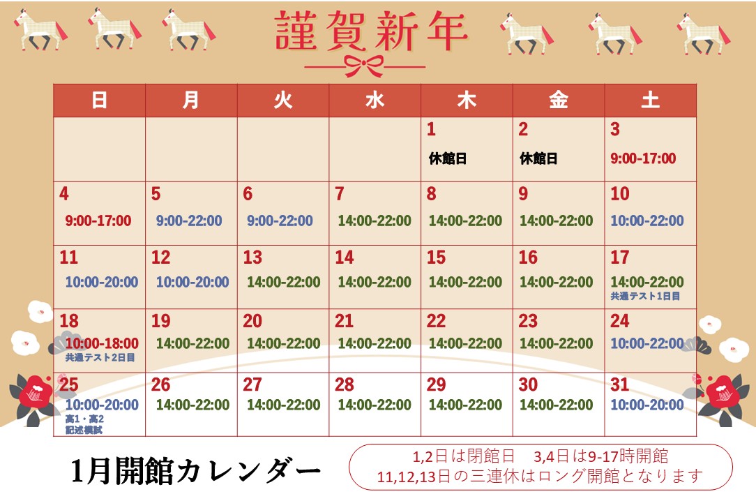 平日・土曜 14:00~22:00日曜・祝日 10:00~18:00※年間では休館日があります。 ※時期によって開館時間が異なることがあります。詳細は校舎にお問い合わせください。