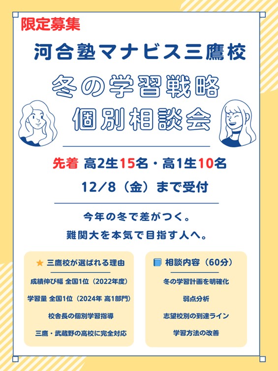 河合塾マナビス 三鷹校へ資料請求・校舎訪問予約は、お電話またはWEBにて承ります。