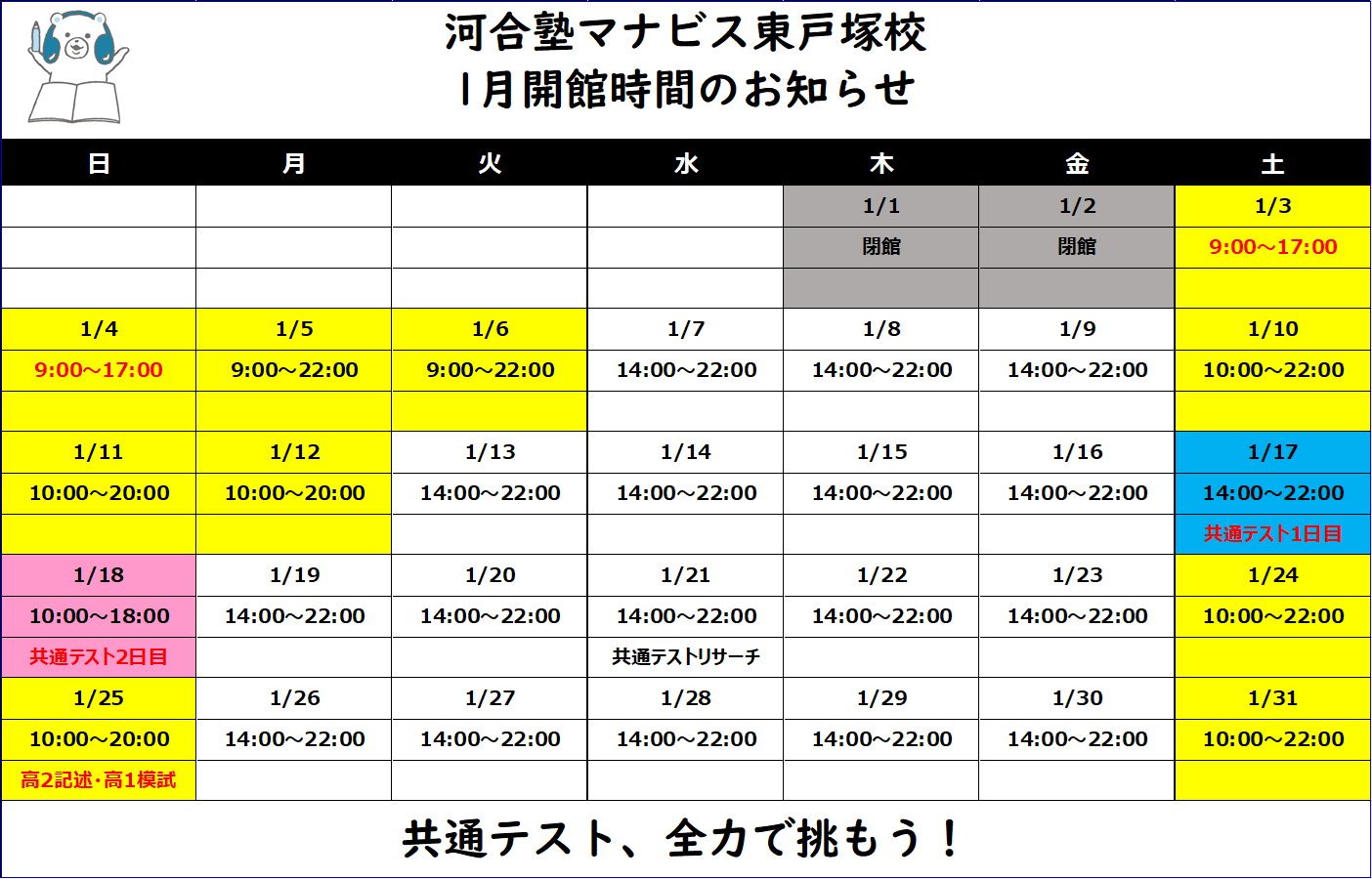 平日・土曜 14:00~22:00 日曜・祝日 10:00~18:00※年間では休館日があります。※時期によって開館時間が異なることがあります。詳細は校舎にお問い合わせください。