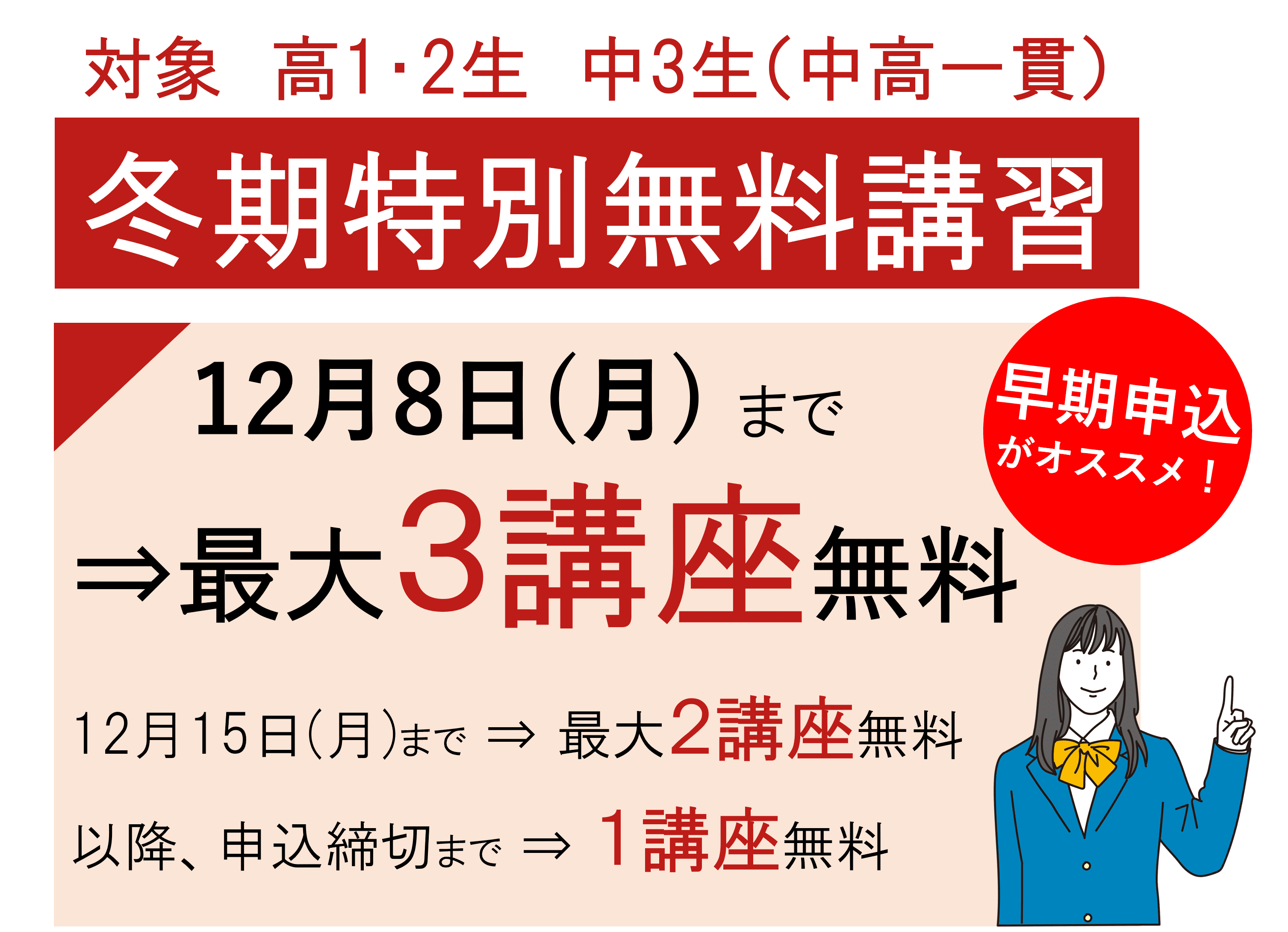 順調に学習が進んでいる人は大学入試レベルに着手して受験生モードへ、基礎に不安がある人は今のうちに弱点克服を河合塾マナビス鷺沼校で冬期特別無料講習に一緒に取り組みましょう。
