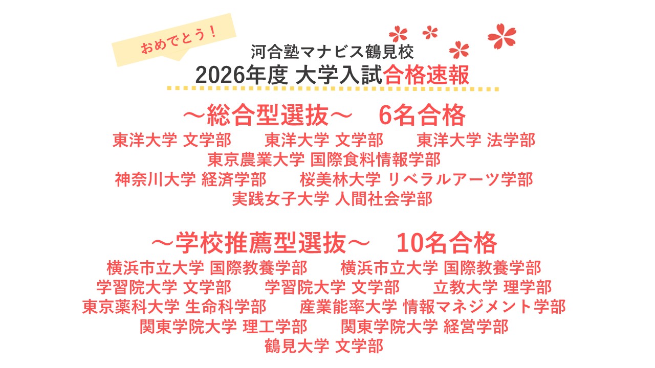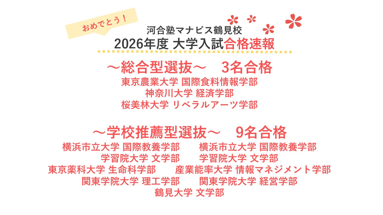 河合塾マナビス鶴見校のホームページを ご覧頂き、ありがとうございます。
