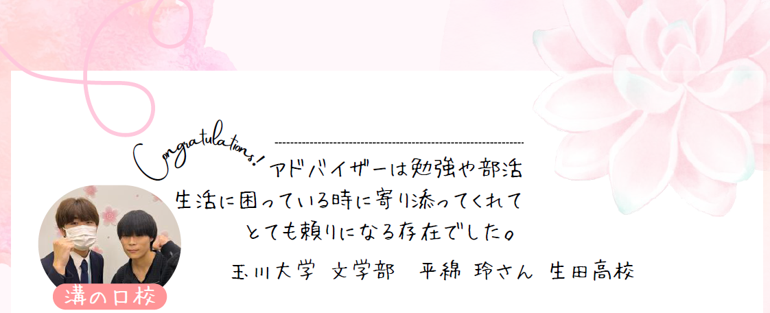 来校することで自然に学習習慣が身に付き、受講後には必ずアドバイスタイムがあるのですぐに復習ができ、効率よく学習出来るところが良かったです。また、映像授業は何度でも見返すことができるので、分からなくなったときや忘れた頃に直せるところも良かったです。