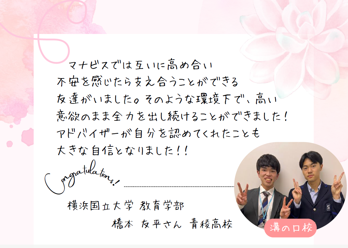 ジムに通いながらでも早慶に合格できたのは、柔軟にスケジュールを組み立てられるマナビスだからこそです。受講はもちろん、自習室としても利用することができ、常に集中しやすい環境で学習を進めることが出来ました。