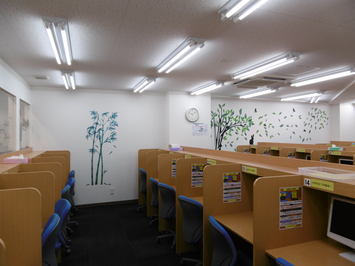 受講ブース・自習ブースは合わせて72席。英語の音読ブースも完備しています。教室型の自習室も完備。内部生たちは、学校の宿題・定期テスト準備でも、校舎を活用しています!開館時間は22時まで。部活で遅くなっても受講は可能です!部活で21時過ぎに来ても、映像授業なので、続きは翌日に…も可能です。