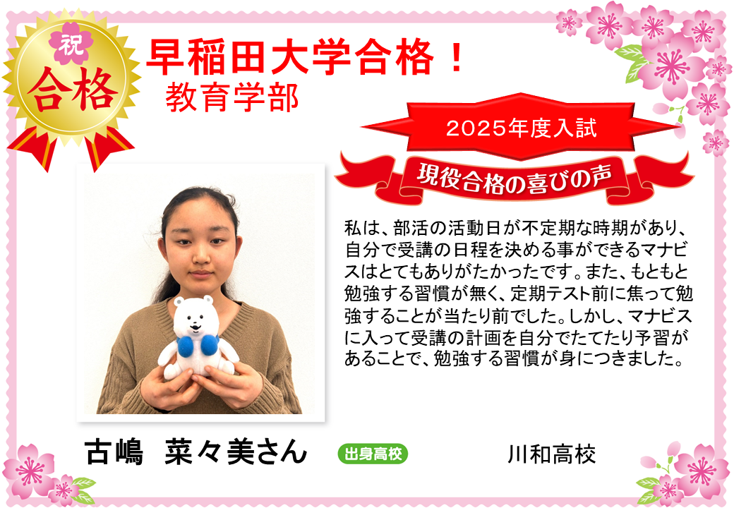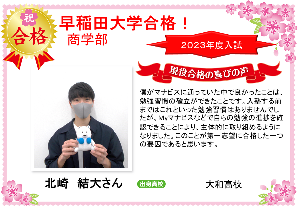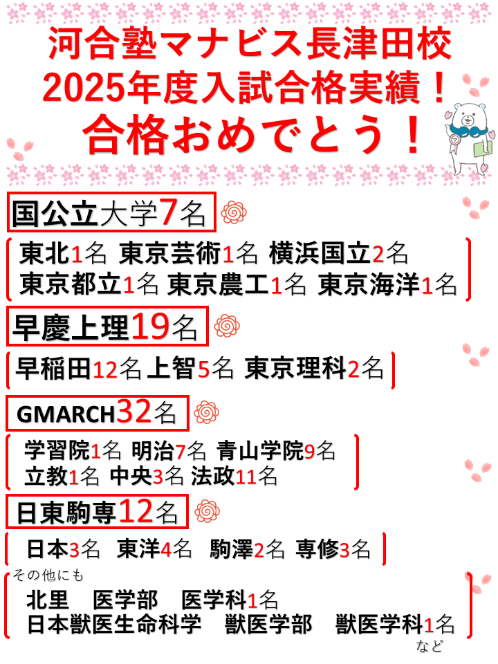 ★都立青山高校 ⇒ 一橋大学合格 ★大和高校 ⇒ 早稲田大学合格 ★座間高校 ⇒ 中央大学合格 マナビス長津田校に通う 生徒の主な在籍高校 ↓↓↓ 横浜翠嵐・川和・大和 市ヶ尾・元石川 桐蔭学園・麻布大附属 町田市在住で 都立高校に通う生徒などなど その生徒に応じた 指導をしております マナビスなら、部活や 学校行事・定期テスト との両立も可能 一般選抜はもちろん 学校推薦型・総合型も マナビスで狙える!