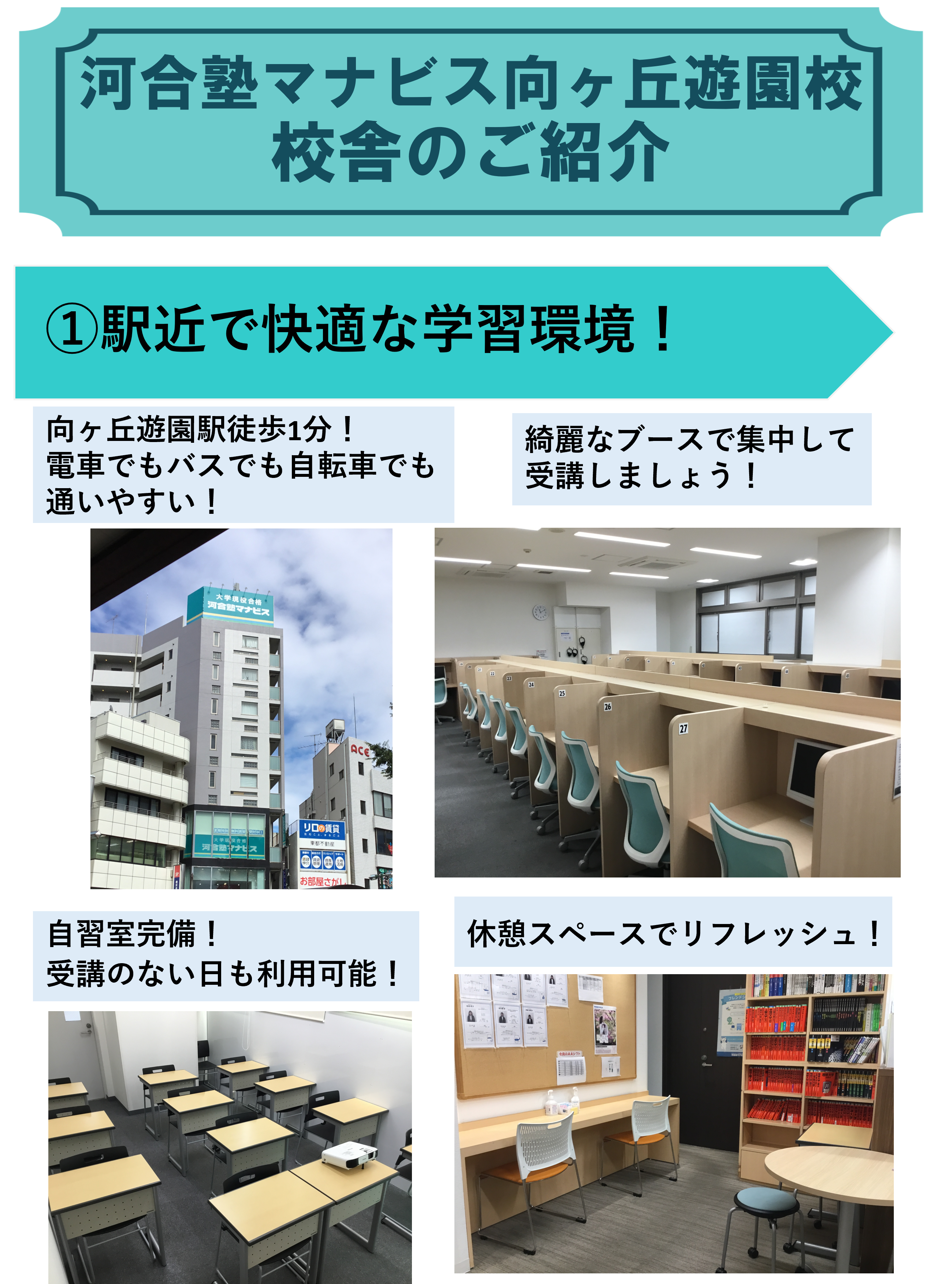 平日・土曜 14:00~22:00日曜・祝日 10:00~18:00※年間では休館日があります。※時期によって開館時間が異なることがあります。詳細は校舎にお問い合わせください。