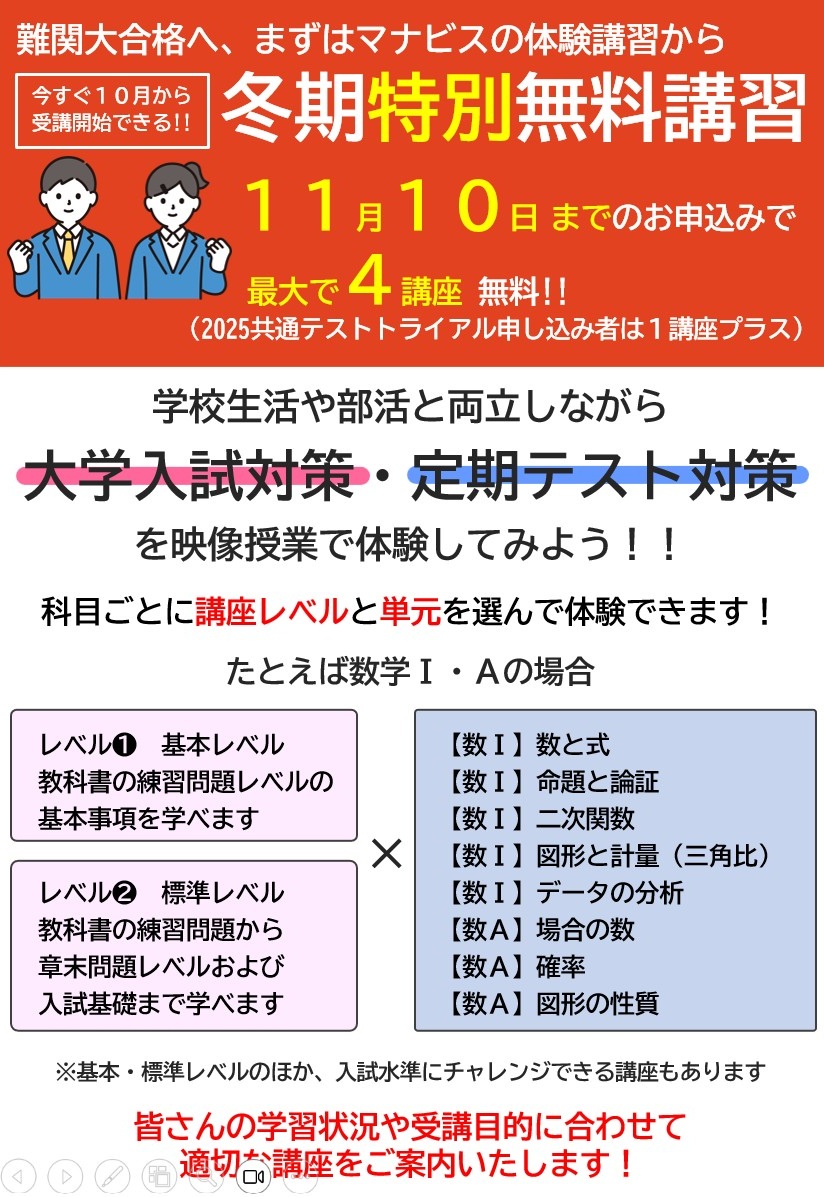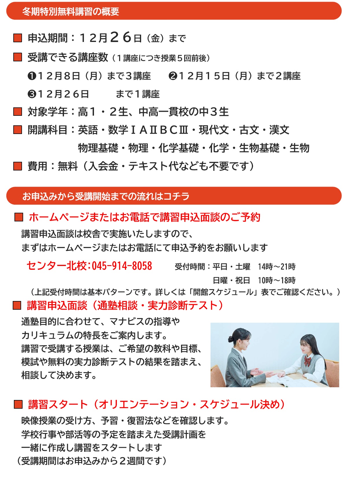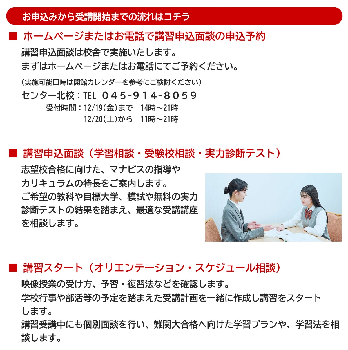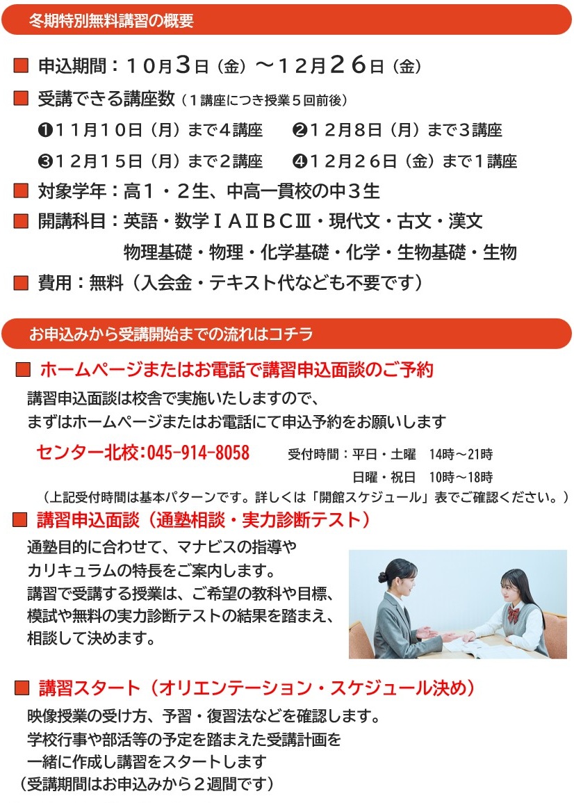 ★1分で分かる★ センター北校 ①駅ビル直結!通学に便利★ 校舎は駅ビル内にあるので改札から徒歩1分! 同フロアは複数のテナントがあり安心安全! ②校舎で効率アップ★ 映像授業でも学習に大切なのは プロのスタッフによる対面指導! 学習方法から志望校の選択まで なんでも相談しましょう! ③毎日開館★ 【開館時間】 平日・土曜 14:00~22:00 日曜 10:00~18:00 祝日 10:00~22:00 ※時期によって開館時間を変更しています。 詳細は校舎案内TOP画面の「お知らせ」をご確認ください。 マナビスセンター北校で、『毎日の学習習慣の定着」を図りましょう!! 【お問い合わせ先】 ********************************* 河合塾マナビス センター北校 ☎:045-914-8058