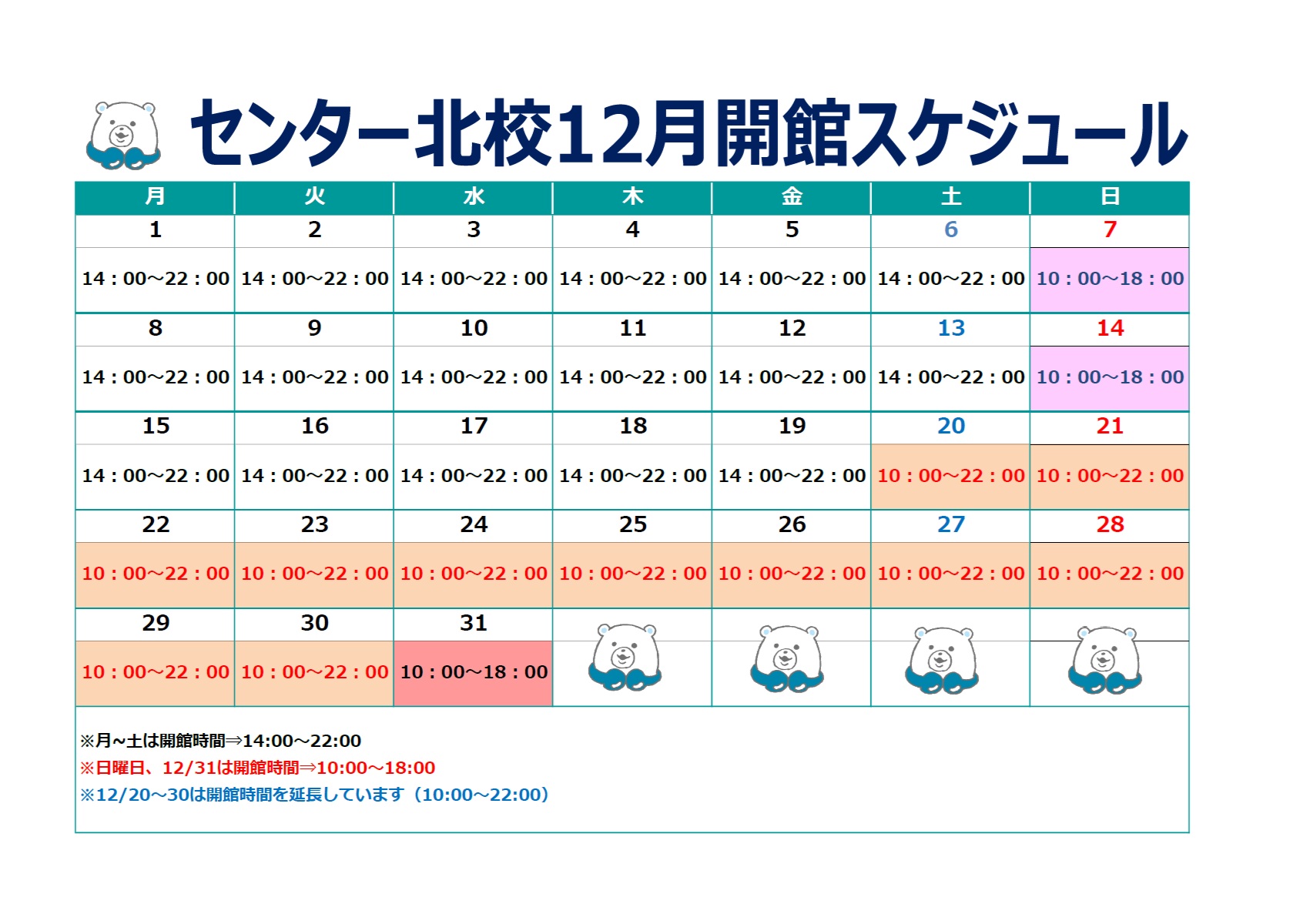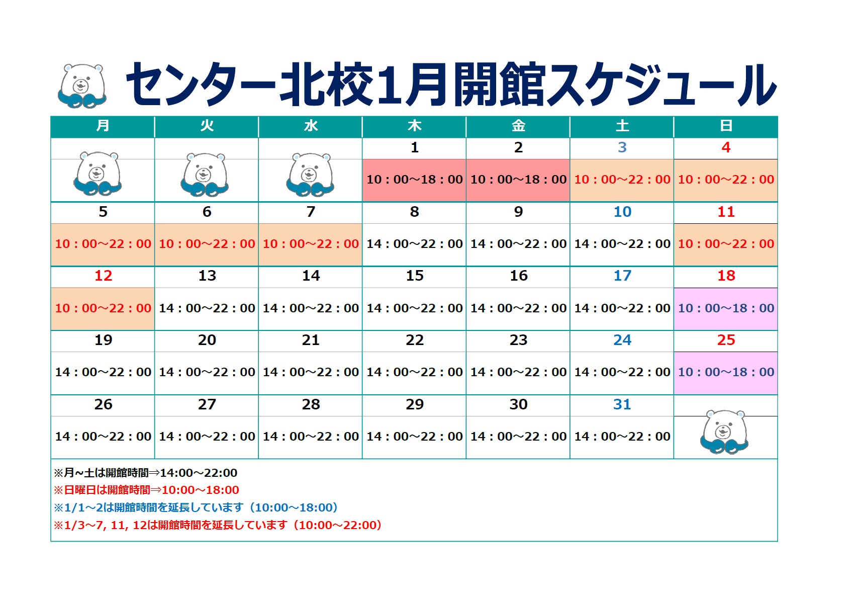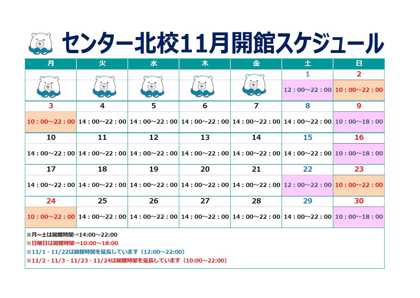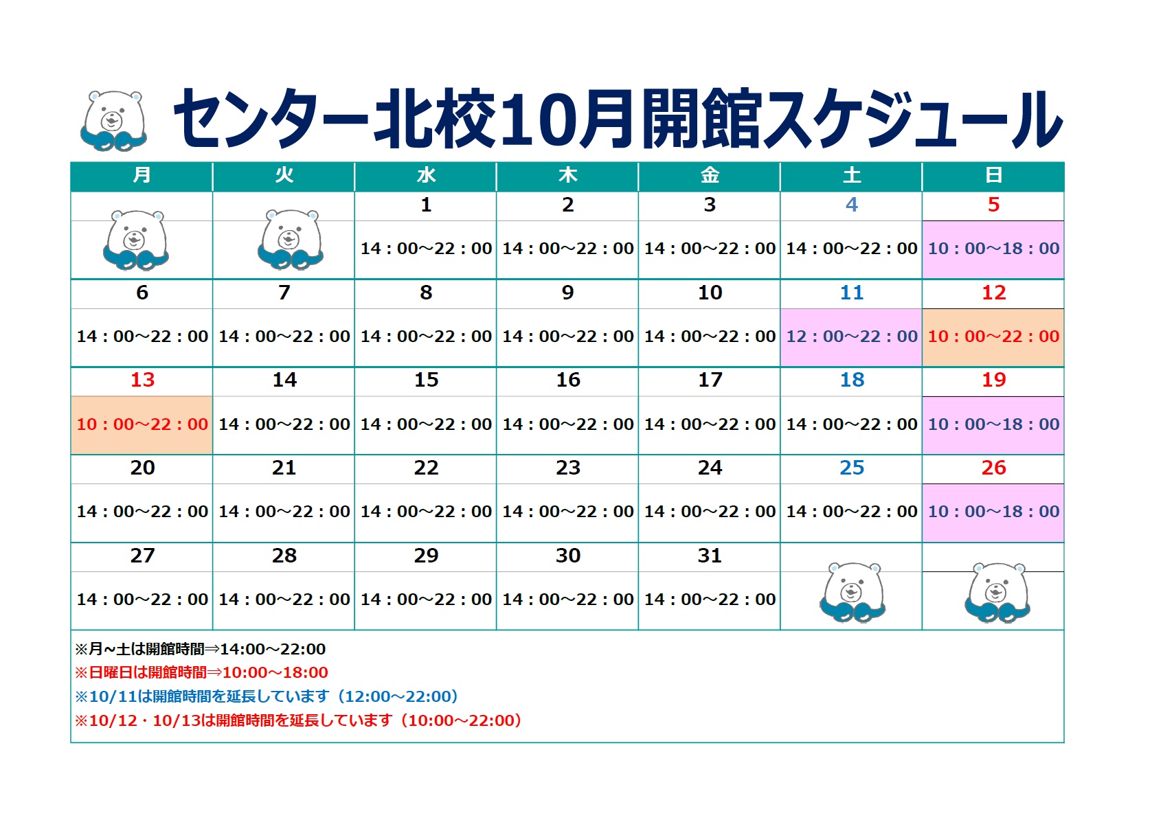平日・土曜 14:00~22:00日曜 10:00~18:00祝日 10:00~22:00※年間では休館日があります。※時期によって開館時間が異なることがあります。詳細は校舎にお問い合わせください。