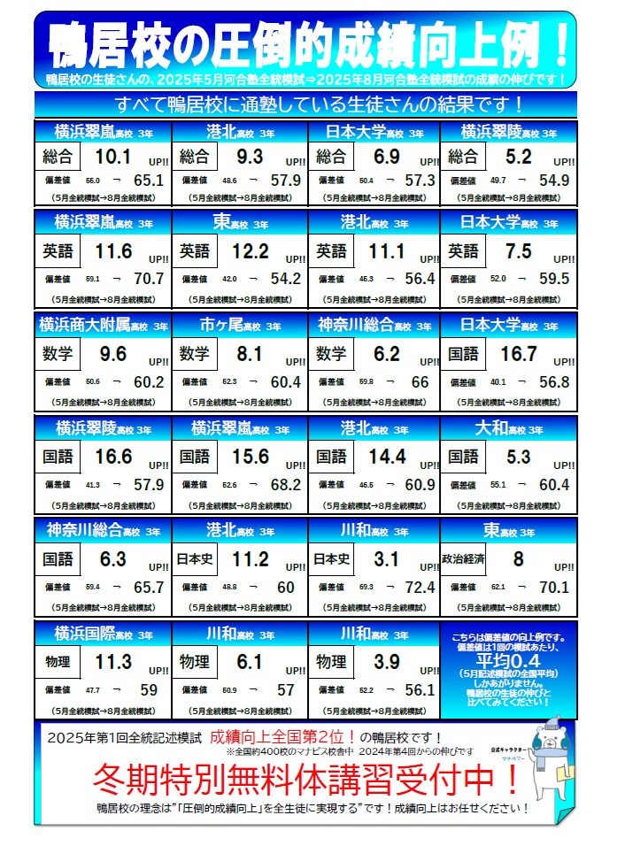 以下は偏差値の伸びを表しています。 全国の受験者の偏差値の伸びは、 たとえば今回の5月記述ト模試では、 全国平均0.4 下の鴨居校の生徒たちの偏差値の伸びと 比較してみてください! ”圧倒的成績向上” に拘る鴨居校です!