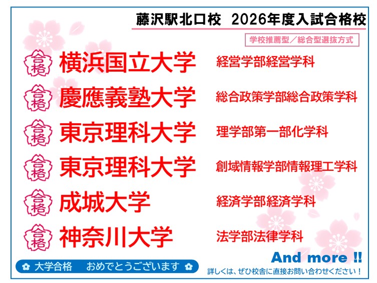 ※以下は、昨年度(2025年4月入学者)の大学入試以前の結果です 2025年 大学入試合格者体験記 【Pick Up!】⇩ ★クリック★ 2024年 大学入試合格実績一覧⇩ ★クリック★ 2024年 大学入試合格者体験記 【Pick Up!】⇩ ★クリック★ ↑ 学年・目的をクリック! ↑ マナビスなら「自分」に合わせて学習できる! 河合塾マナビス藤沢駅北口校にようこそ! 「私たちが皆さんの大学受験を 全力でサポートします!!」 ■河合塾マナビス藤沢駅北口校の 『授業』の強みはこちらをクリック! ①WEBから校舎へのお問合せはこちら↓