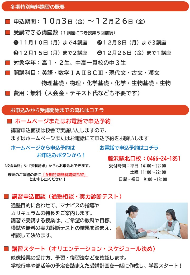 この他にも多数のスタッフが在籍しております。 スタッフ紹介はこちらから。 藤沢駅北口校には、近隣高校だけでなく 都内・県内私立など広い地域から 多くの生徒様が通っております。 様々な高校に通われる生徒様 一人ひとりのニーズにお応えできるのも マナビス藤沢駅北口校の強みです! 河合塾マナビスは、「何時からでも」 自分の目標に向けて学習が始められます。 現在、他の塾・予備校に通っていても大丈夫! 映像・集団・個別…どんな指導形式からも 変更や併用をすることができます! まずは無料の学力診断・学習相談から。 ぜひ校舎までお問い合わせください!!
