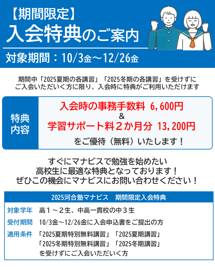 🌸学習相談会🌸 大学入試は意外と複雑です!みなさんの不安や悩みを解消し、安心して志望校合格への第一歩を踏み出せるようサポートします。 日々の学習についてや、定期テスト対策などもぜひご相談下さい。 一緒に考えましょう!