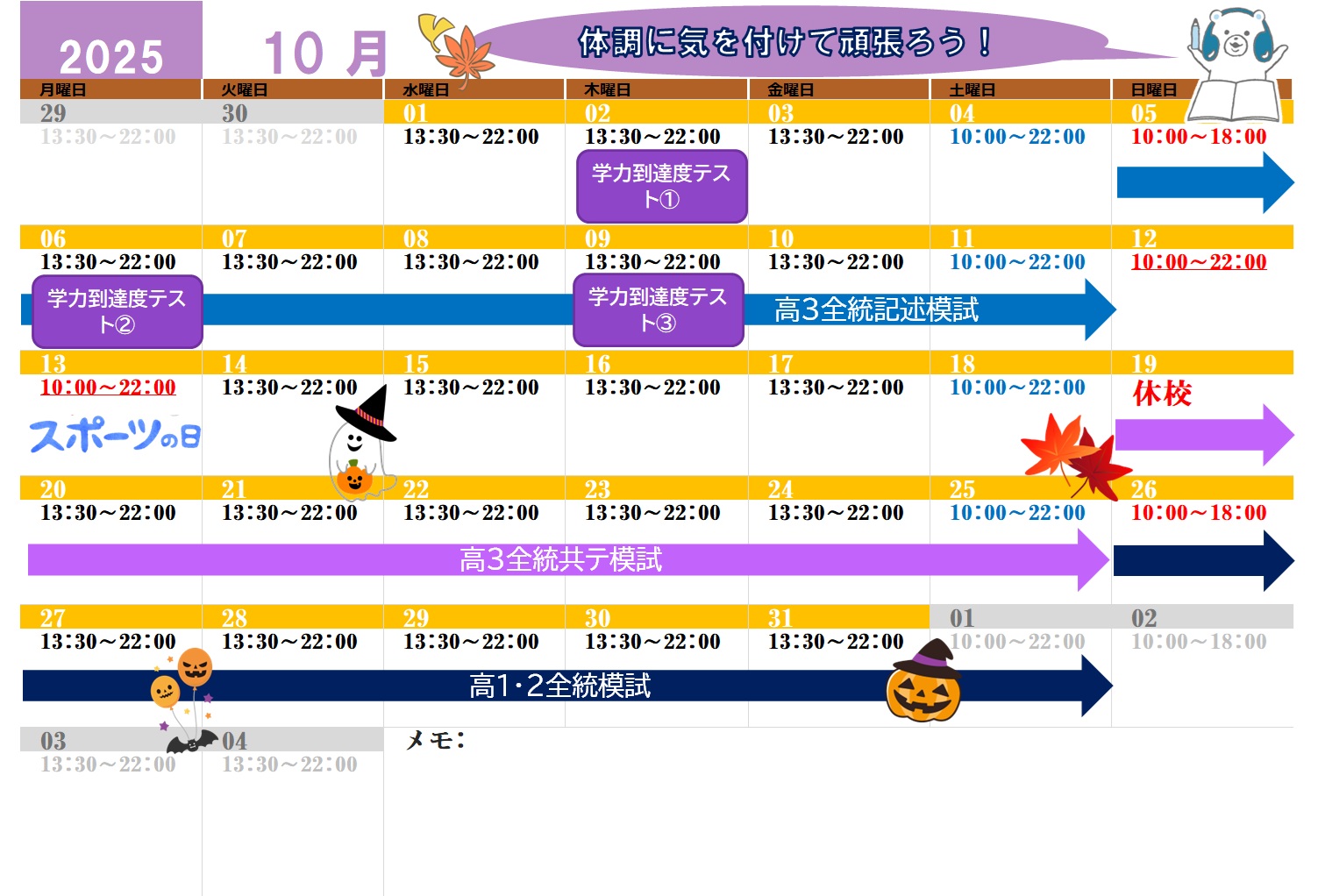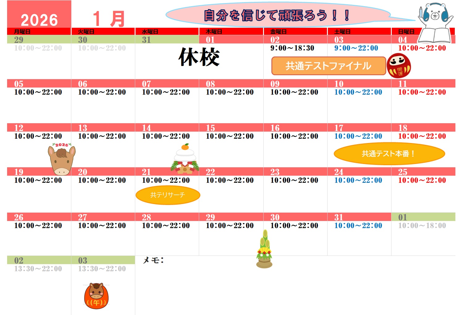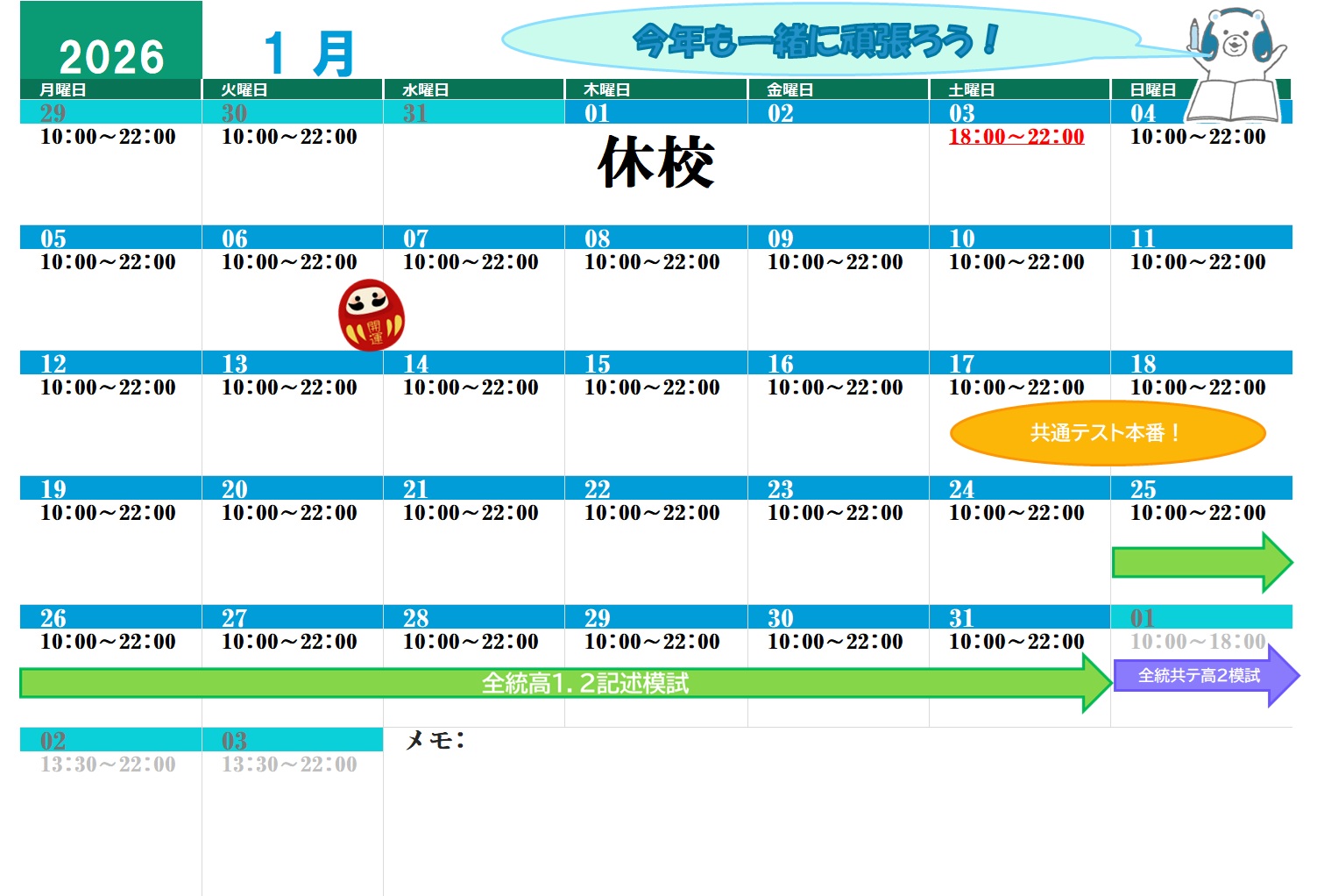 平日 13:30~22:00土曜・祝日 10:00~22:00日曜 10:00~18:00※年間では休館日があります。※時期によって開館時間が異なることがあります。詳細は校舎にお問い合わせください。