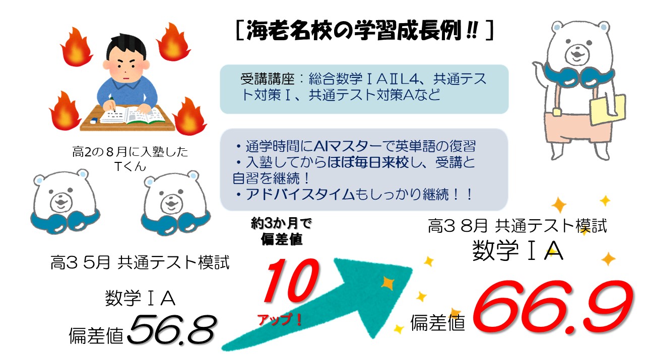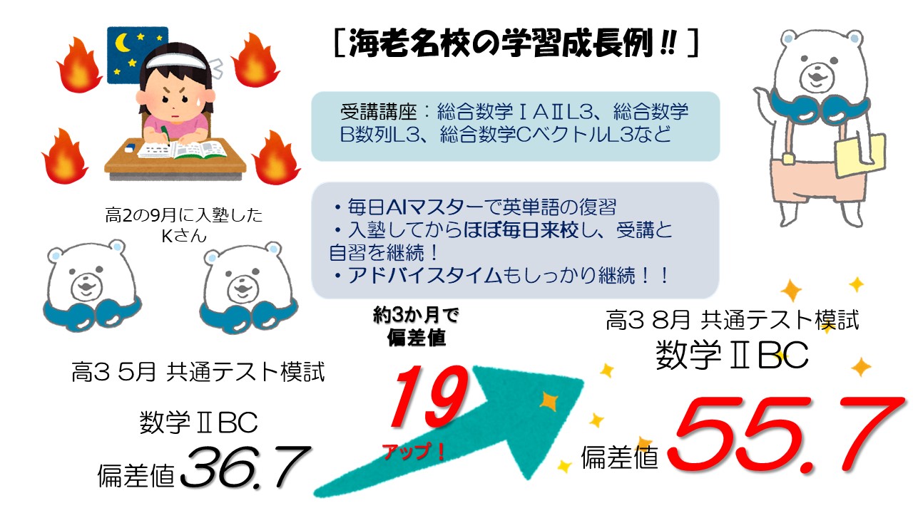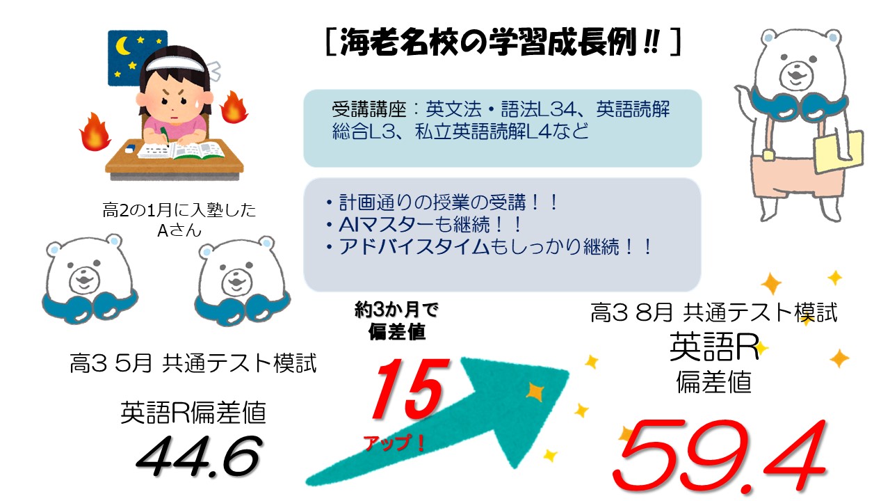 河合塾マナビス海老名校にアクセスいただきましてありがとうございます。 校舎長の佐藤と申します。 9月は前期期末テスト、文化祭など学校行事が多い月です。 10月は高2生の年内最後の模試があります。 9月の勉強が疎かになると10月の模試結果に影響出てしまいます。 特に高2生は1年後の模試は最後の記述模試になります。 高2の秋から受験勉強を始める生徒が多いので忙しい中でも 勉強時間を確保していきましょう。 河合塾マナビスでは体験授業受付中ですので受験に向けて通塾を 検討されているようでしたら是非お問い合わせください。 ご連絡お待ちしております。
