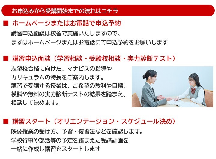 校舎HPをご覧になっていただき、ありがとうございます。河合塾マナビス新潟駅前校は早期より多くの生徒様にお通い頂いております。既にお通い頂いている生徒様に適切な指導と学習環境を提供するために2025年度の高校3年生の生徒様の新規のお問い合わせと入会のご相談は、受付停止とさせていただきます。なお、高校1・2年生のご入会希望は受け付けておりますので、校舎まで直接お電話でご相談ください。河合塾マナビス 新潟駅前校電話番号:025-240-7181