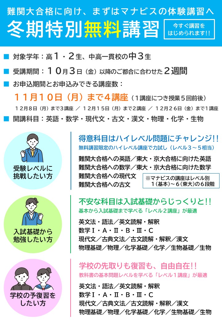 冬期特別無料講習のご案内 新高1・高2生の皆様へ ご友人から紹介を受けた方はこちら (河合塾マナビス新潟駅前校のご紹介) 2024年度 合格実績