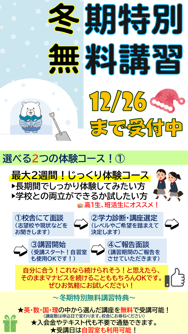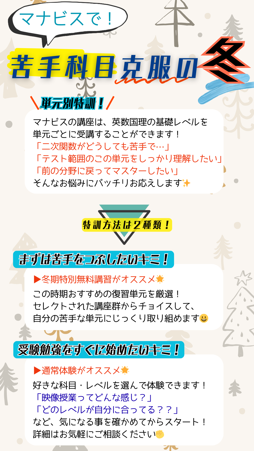 上田市で大学受験を考えたら、河合塾マナビス上田校へ。 ホームページにアクセスいただきありがとうございます。 どうぞごゆっくりご覧ください。 ↓気になる内容へページジャンプ↓ 冬期特別無料講習のお知らせ 上田校を紹介します! 卒業生に聞いた!マナビスで成長できたこと 2025年度入試結果 高2生はこちら 高1生はこちら 【お電話でのお問い合わせ】 0268-29-4811