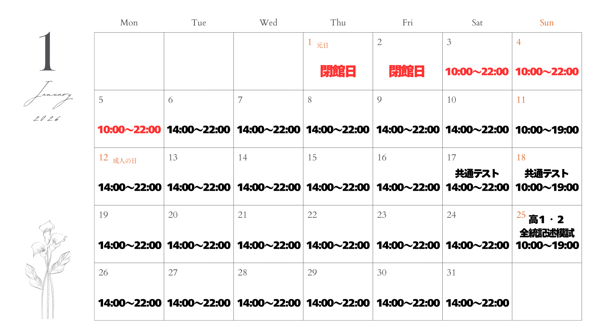 平日・土曜 14:00~22:00日曜・祝日 10:00~19:00※年間では休館日があります。※時期によって開館時間が異なることがあります。詳細は校舎にお問い合わせください。