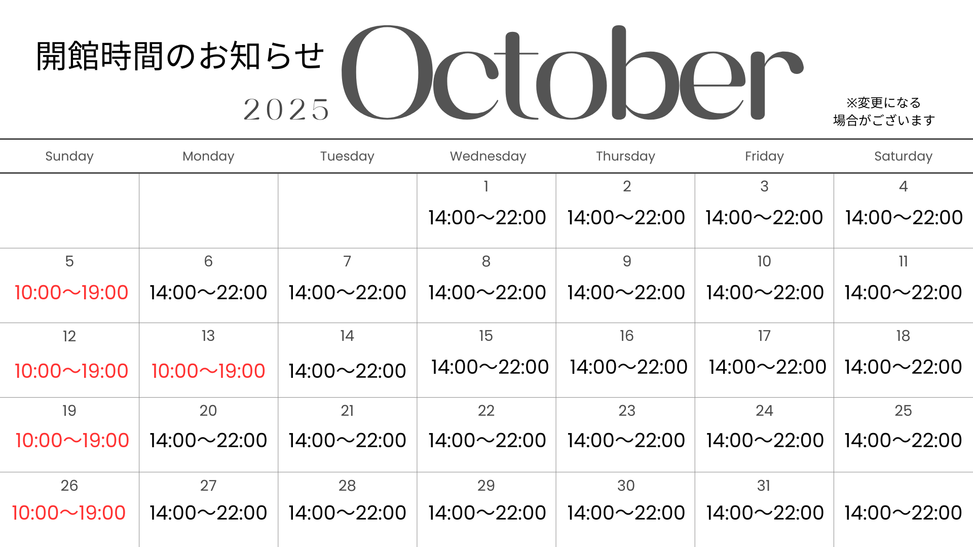 平日・土曜 14:00~22:00日曜・祝日 12:00~20:00※年間では休館日があります。※時期によって開館時間が異なることがあります。詳細は校舎にお問い合わせください。