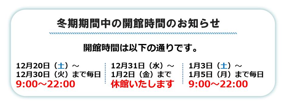 平日 14:00~22:00 土曜 13:00~22:00 日曜・祝日 10:00~18:00※年間では休館日があります。※時期によって開館時間が異なることがあります。詳細は校舎にお問い合わせください。