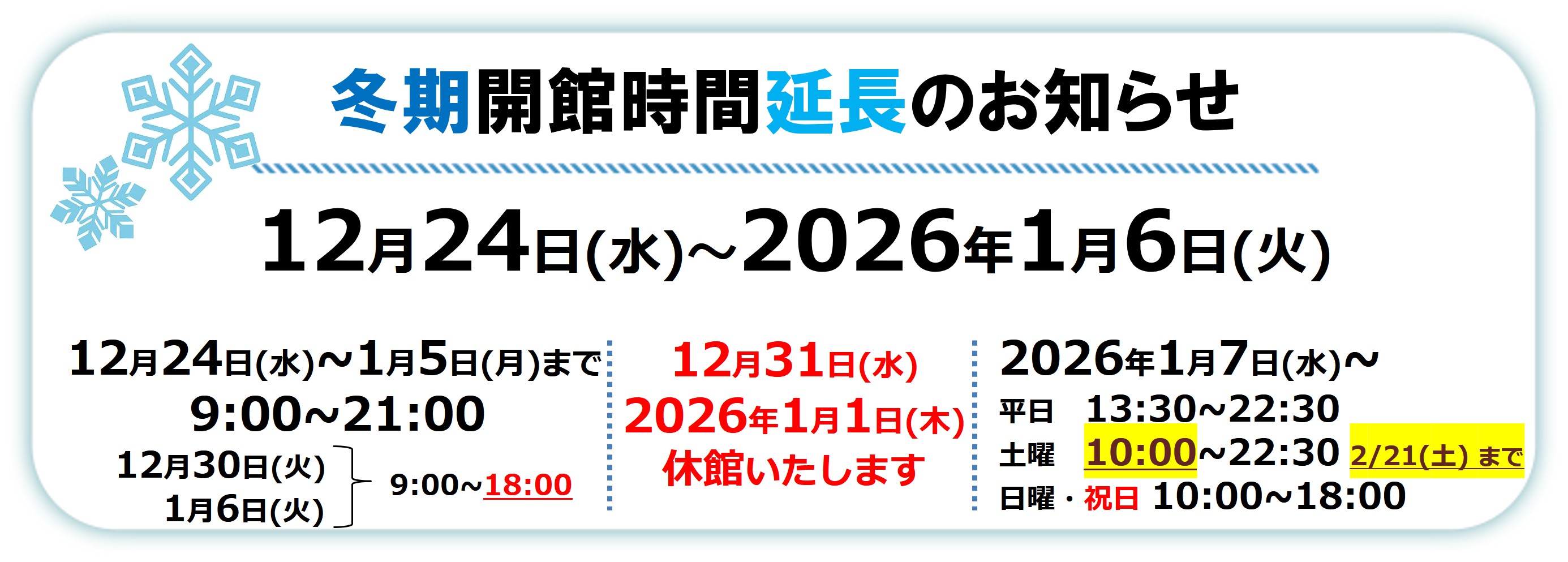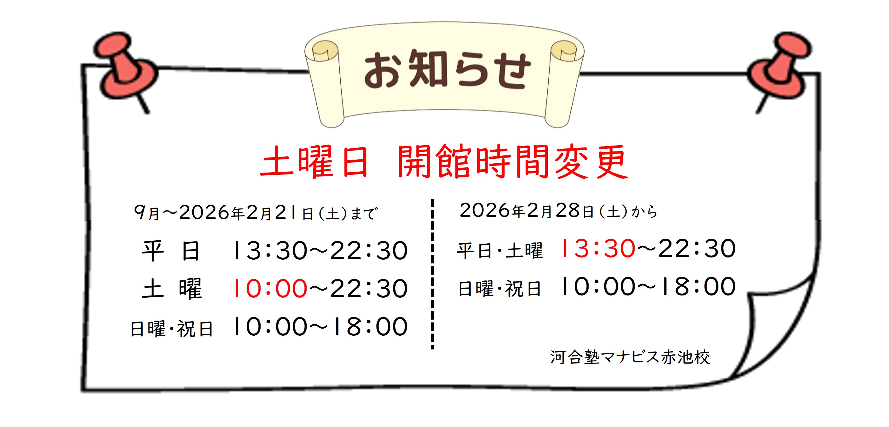 平日・土曜 13:30~22:30日曜・祝日 10:00~18:00※年間では休館日があります。 ※時期によって開館時間が異なることがあります。詳細は校舎にお問い合わせください。