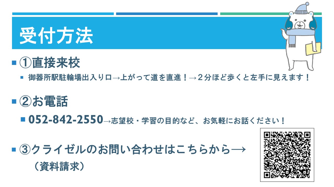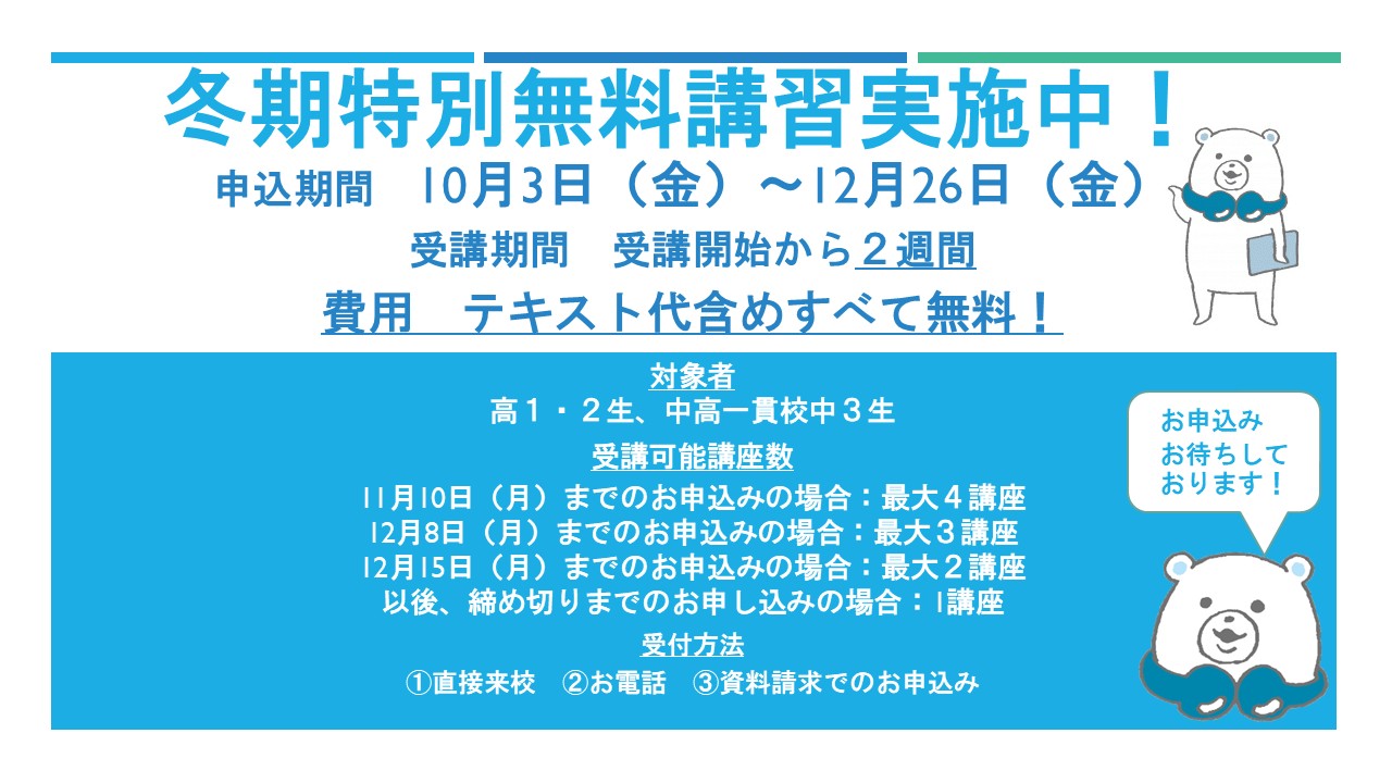 平日・土曜 14:00~22:00日曜・祝日 10:00~18:00※年間では休館日があります。※時期によって開館時間が異なることがあります。詳細は校舎にお問い合わせください。