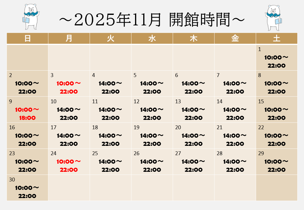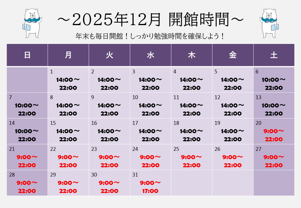 平日・土曜 14:00~22:00 日曜・祝日 10:00~18:00※年間では休館日があります。※時期によって開館時間が異なることがあります。詳細は校舎にお問い合わせください。