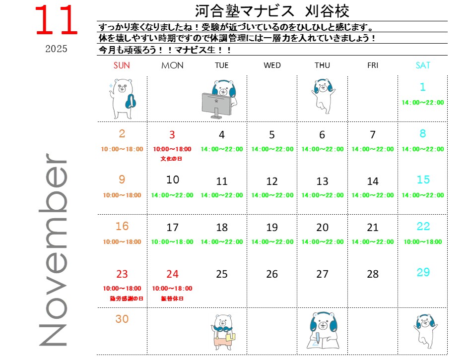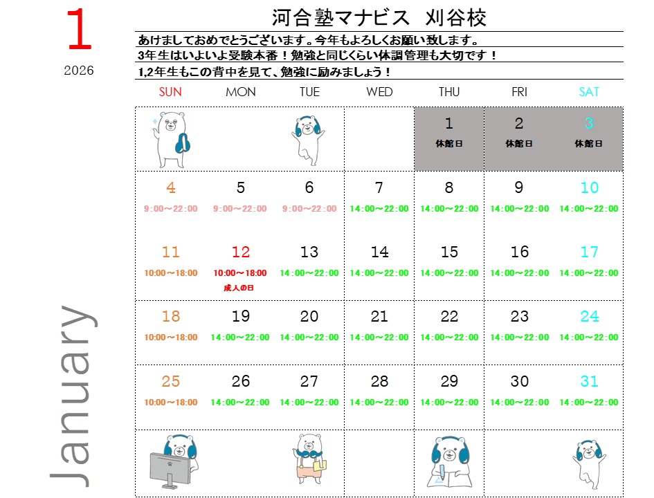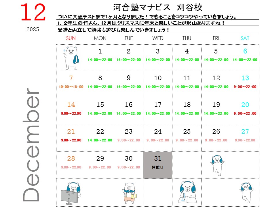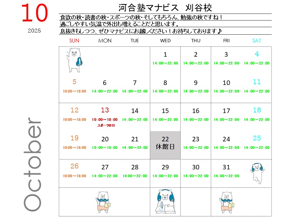 平日・土曜 14:00~22:00日曜・祝日 10:00~18:00※年間では休館日があります。※時期によって開館時間が異なることがあります。詳細は校舎にお問い合わせください。