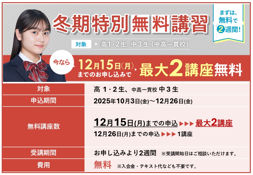 冬期特別無料講習では、英語の時制・助動詞・仮定法、数学の二次関数・確率など、単元別に学習する『高校学習対応講座』を中心に受講できます。単元ごとに基礎からみっちり勉強できるので、苦手分野を克服したい方や、学校でまだ習ってない範囲を予習したい方におすすめです。(一部の冬期限定講座では発展レベルの勉強も可能です。)